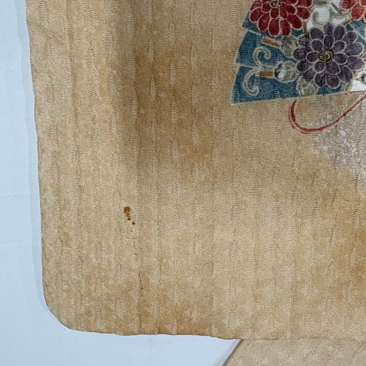 振袖 身丈168cm 裄丈66.5cm M 袷 橘 檜扇 金糸 絞り風 山吹茶色 正絹 秀品