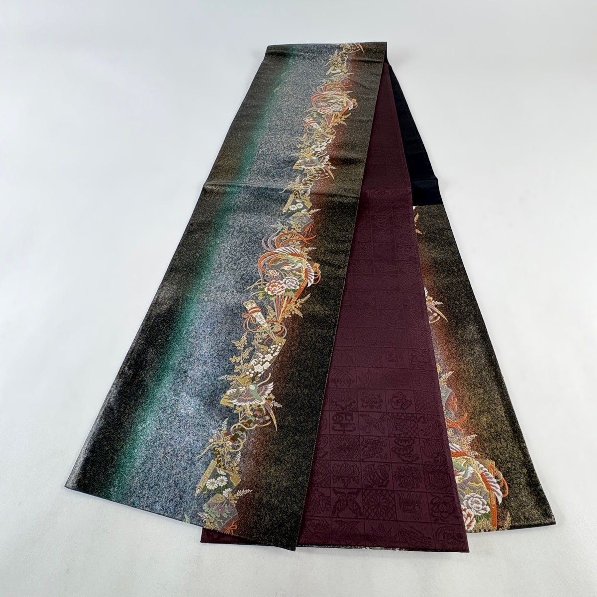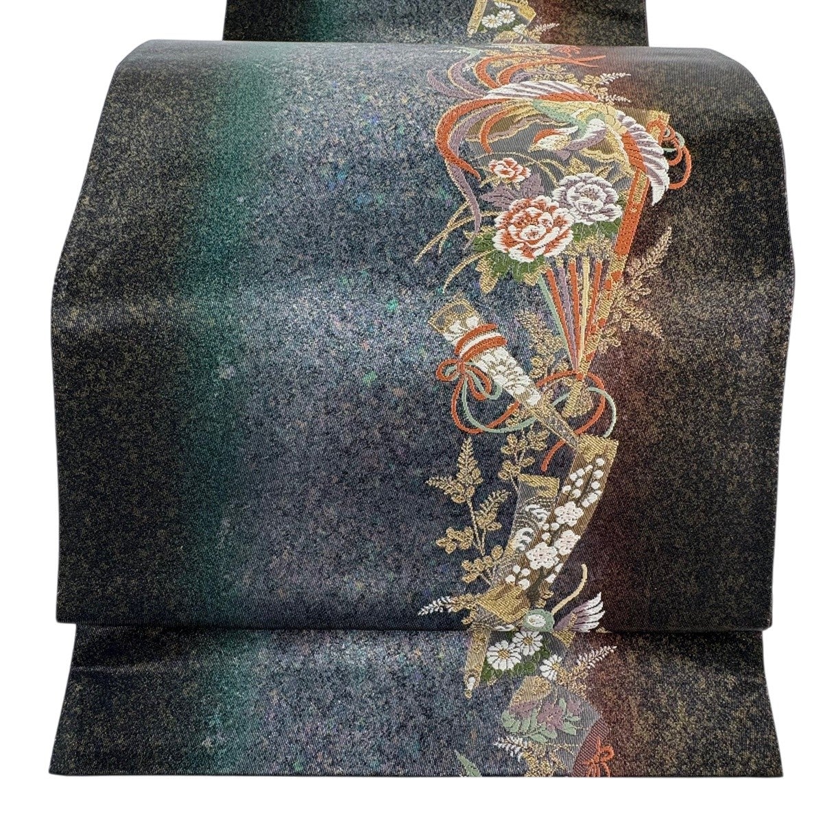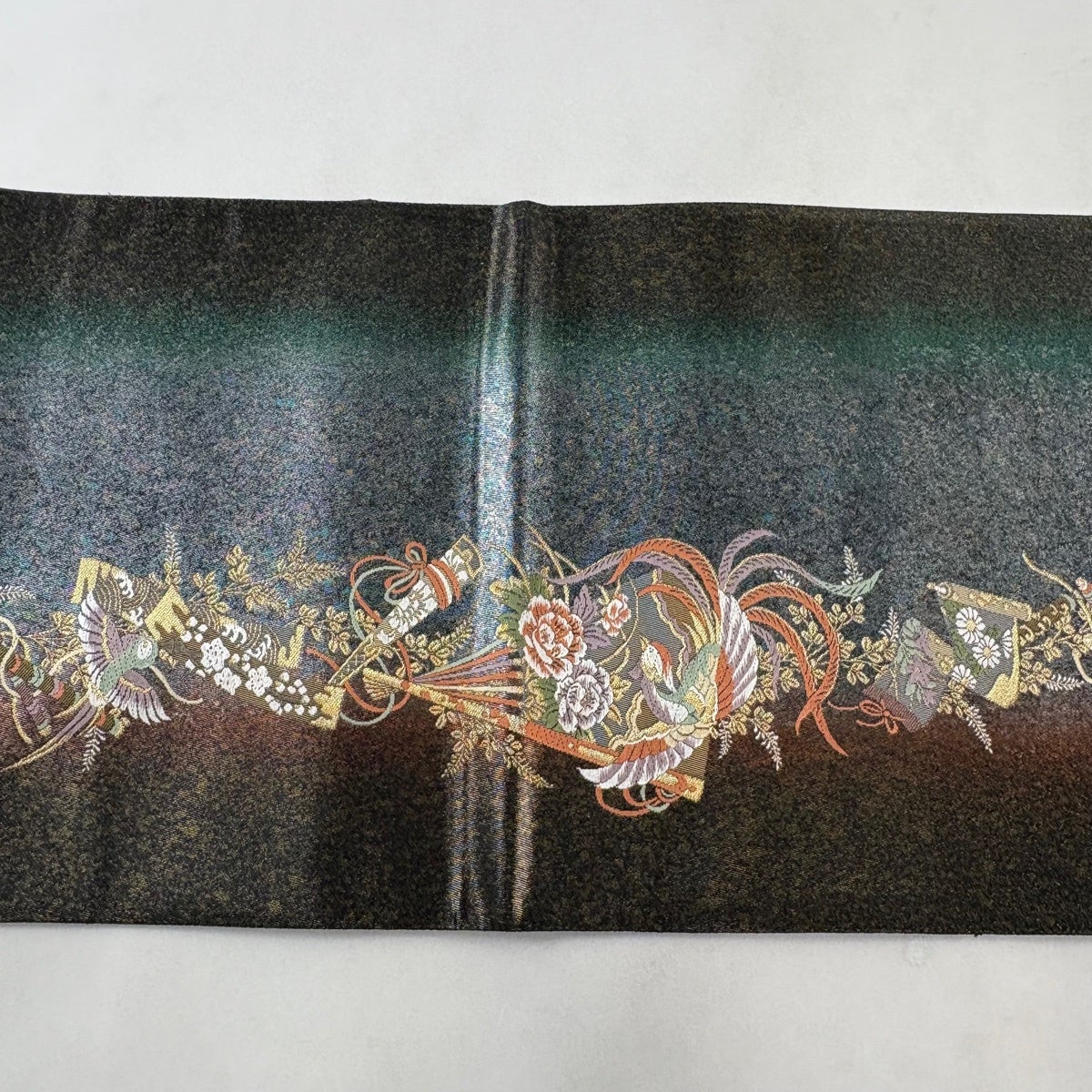 【美品】 袋帯 名品 落款あり 徳川美術館秘蔵 能楽百扇 花鳥 金糸 箔 薄青緑 お太鼓柄 正絹