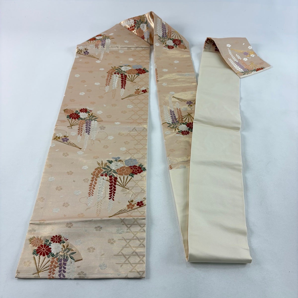 名古屋帯 秀品 夏帯 絽 トンネル仕立て 椿 団扇 金銀糸 ピンクベージュ 正絹
