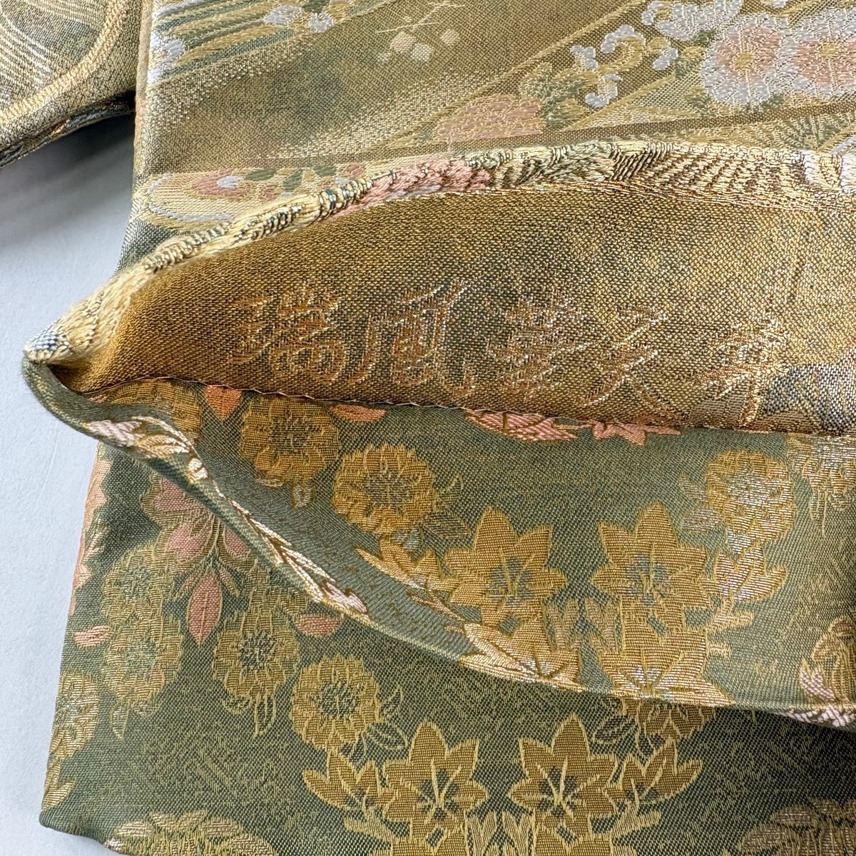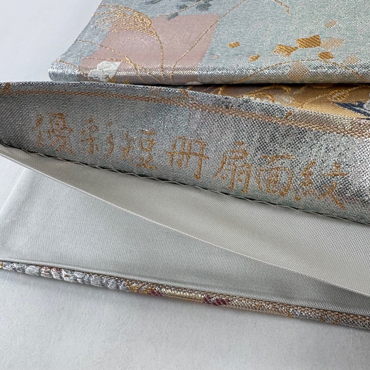 【美品】 袋帯 名品 落款あり 証紙あり 檜扇 草花 金銀糸 刺繍 銀色 六通 正絹