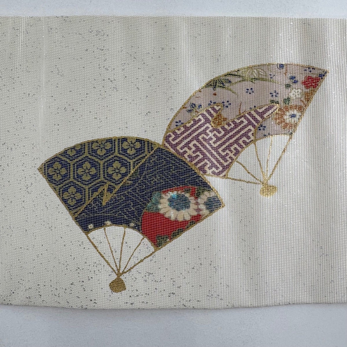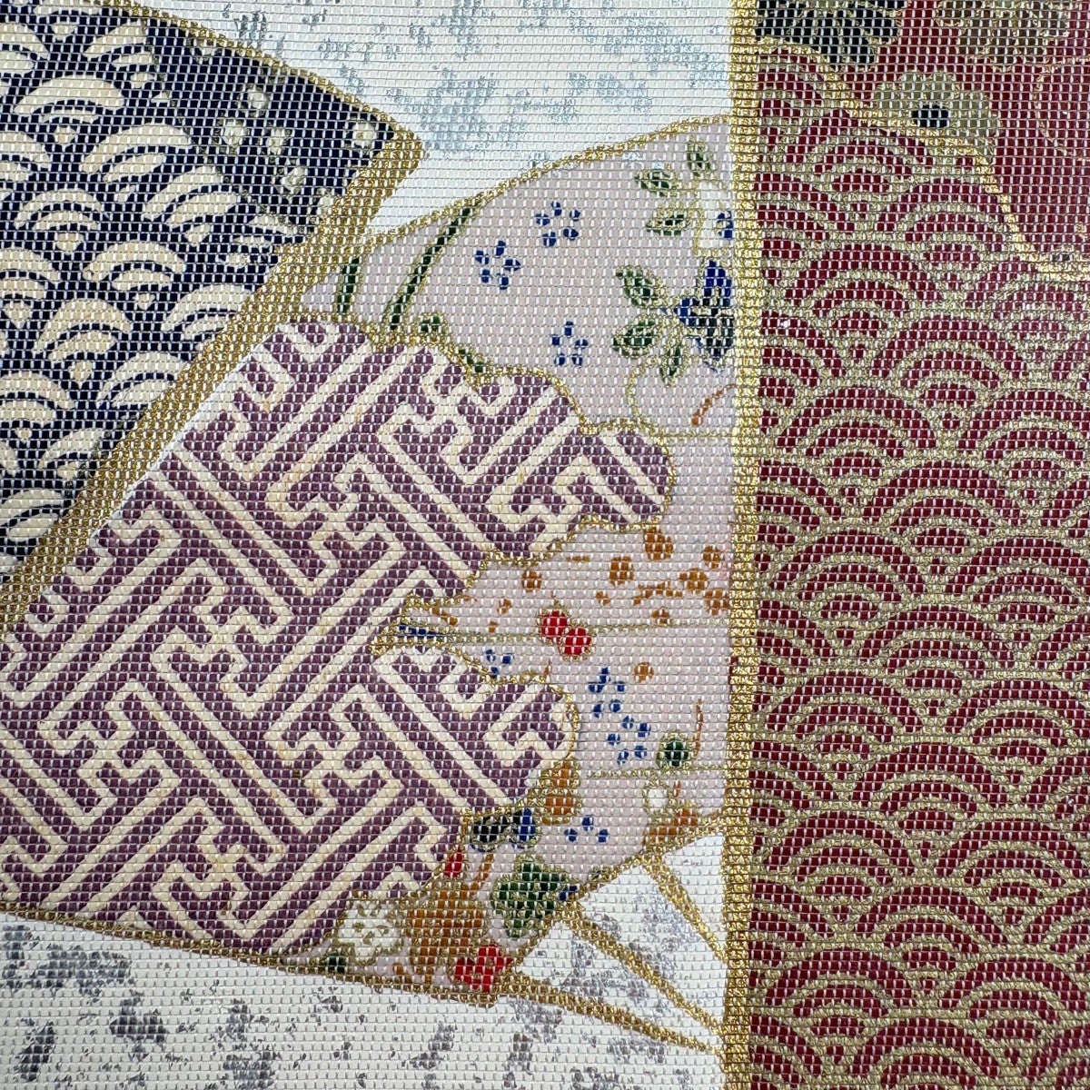 袋帯 逸品 河合美術織物 落款あり 扇 渦巻き 唐織 箔 灰紫 六通 正絹
