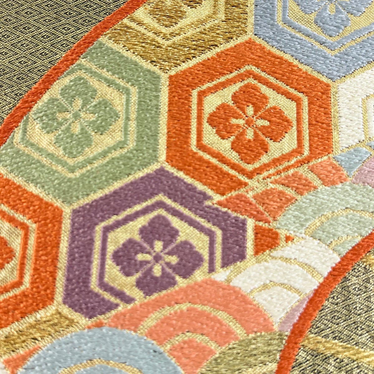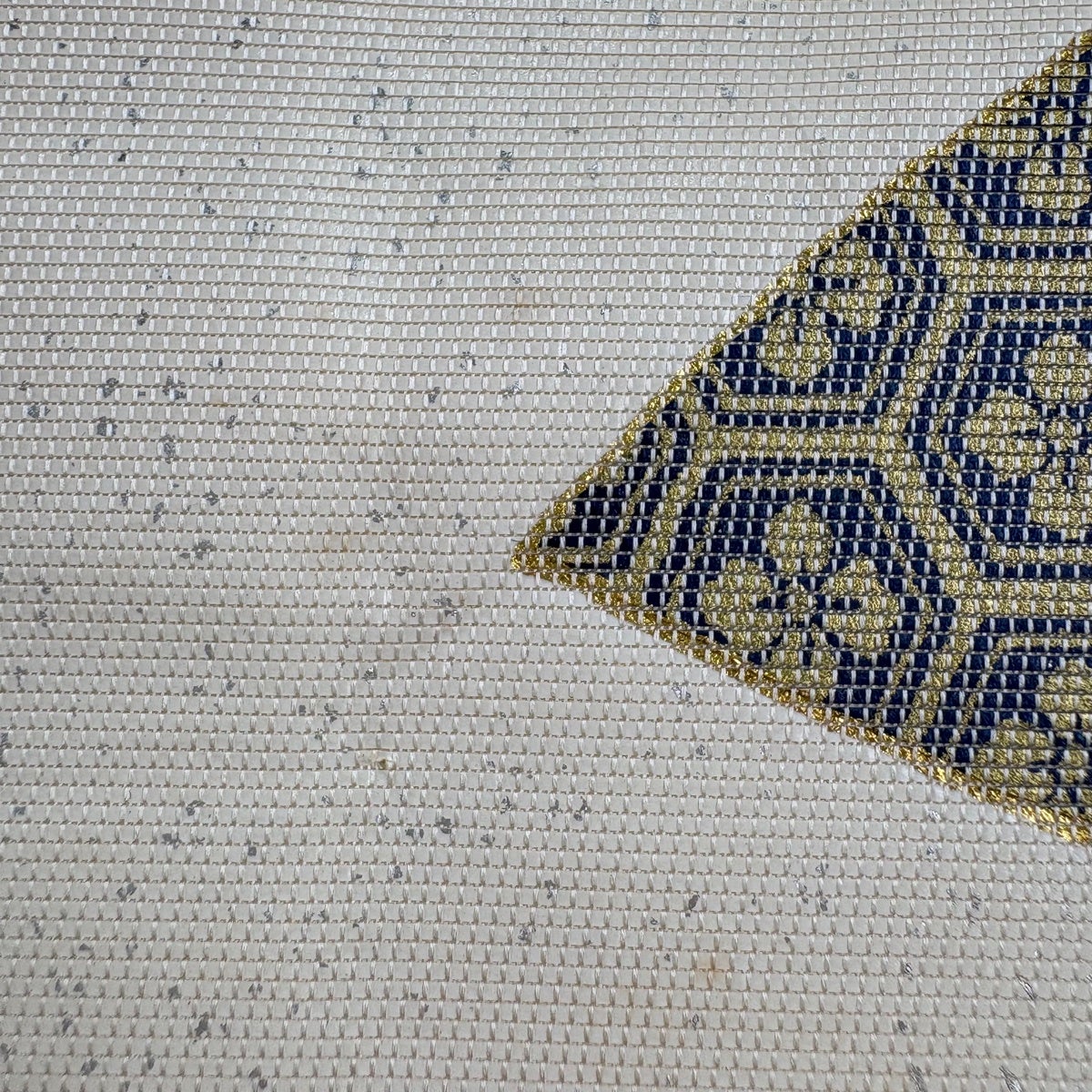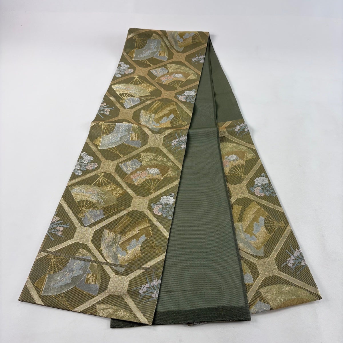【在庫一掃】 【美品】 名古屋帯 優品 扇 青海波 金糸 刺繍 銀色 正絹