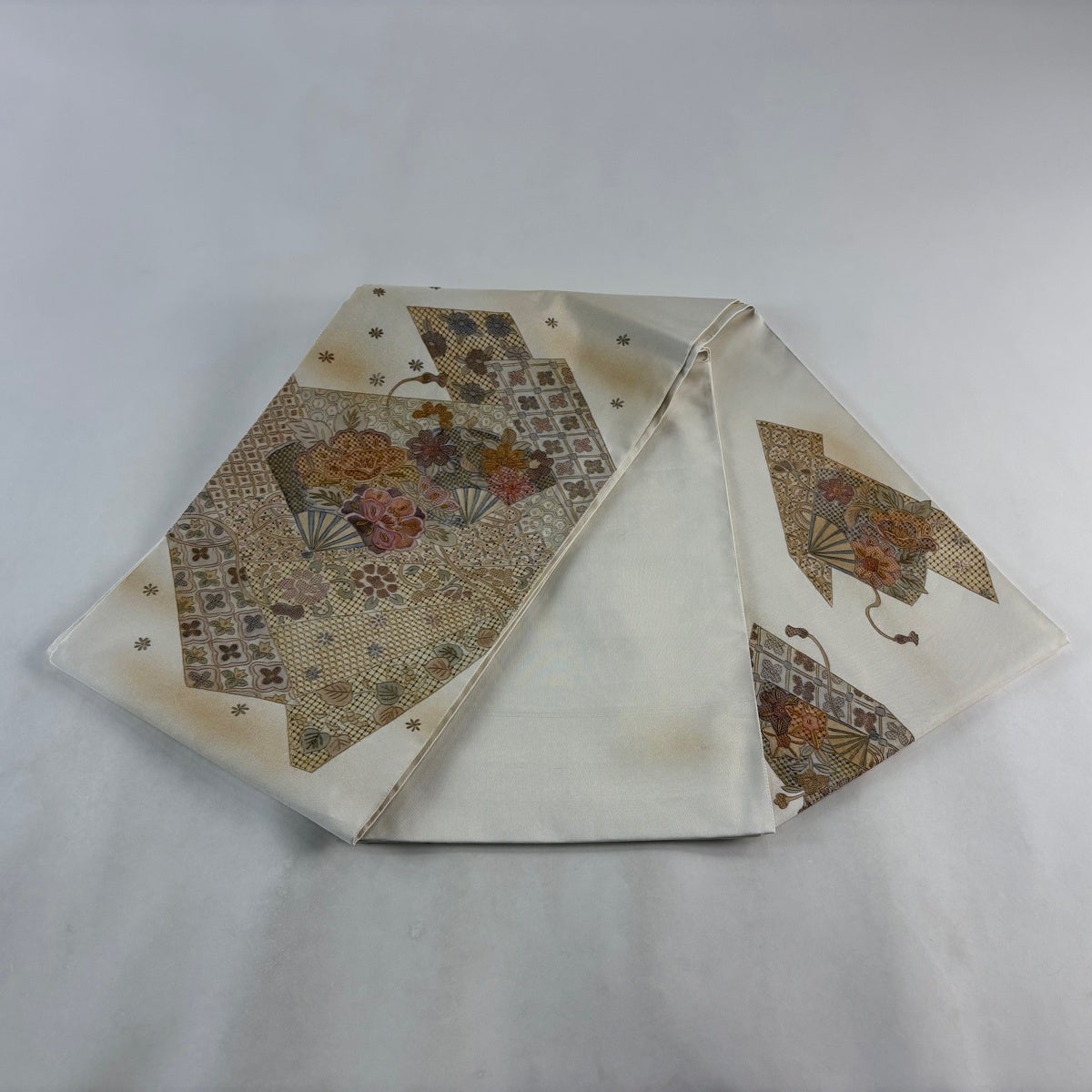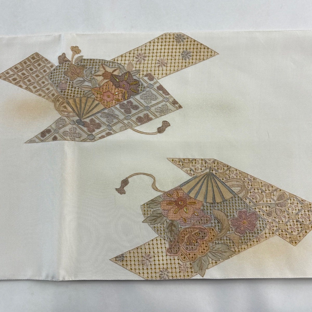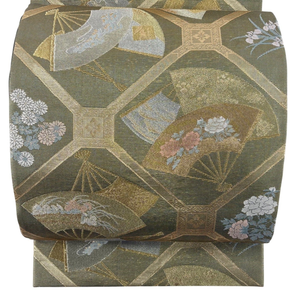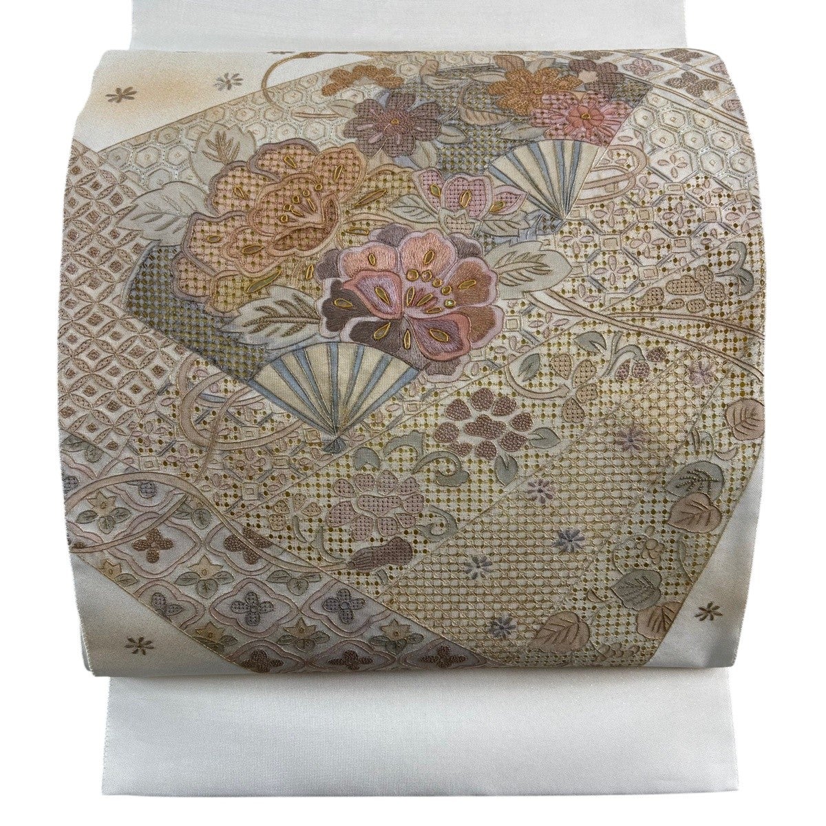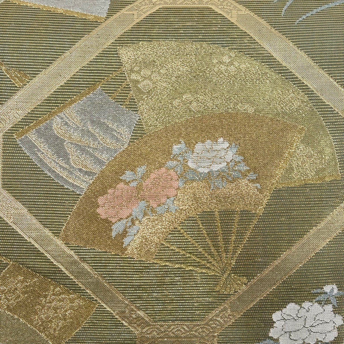 【美品】 袋帯 逸品 花丸文 扇 金糸 ベージュ お太鼓柄 正絹