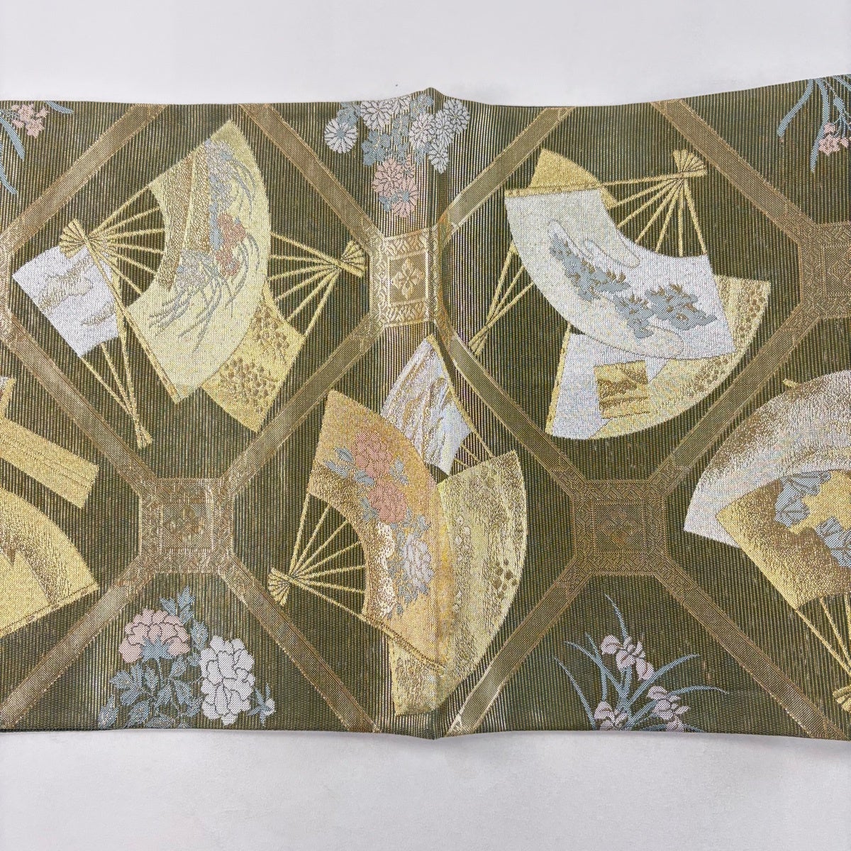 袋帯 秀品 落款あり 風物扇面散し 扇 草花 金糸 箔 金色 六通 正絹
