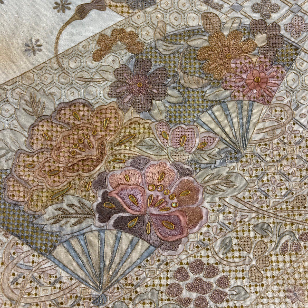 訪問着 身丈164cm 裄丈64cm M 袷 扇 桜 金糸 金彩 薄茶色 正絹 秀品