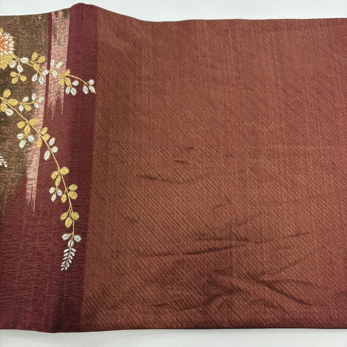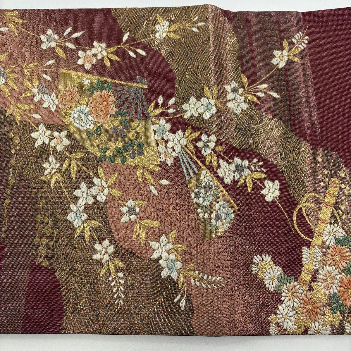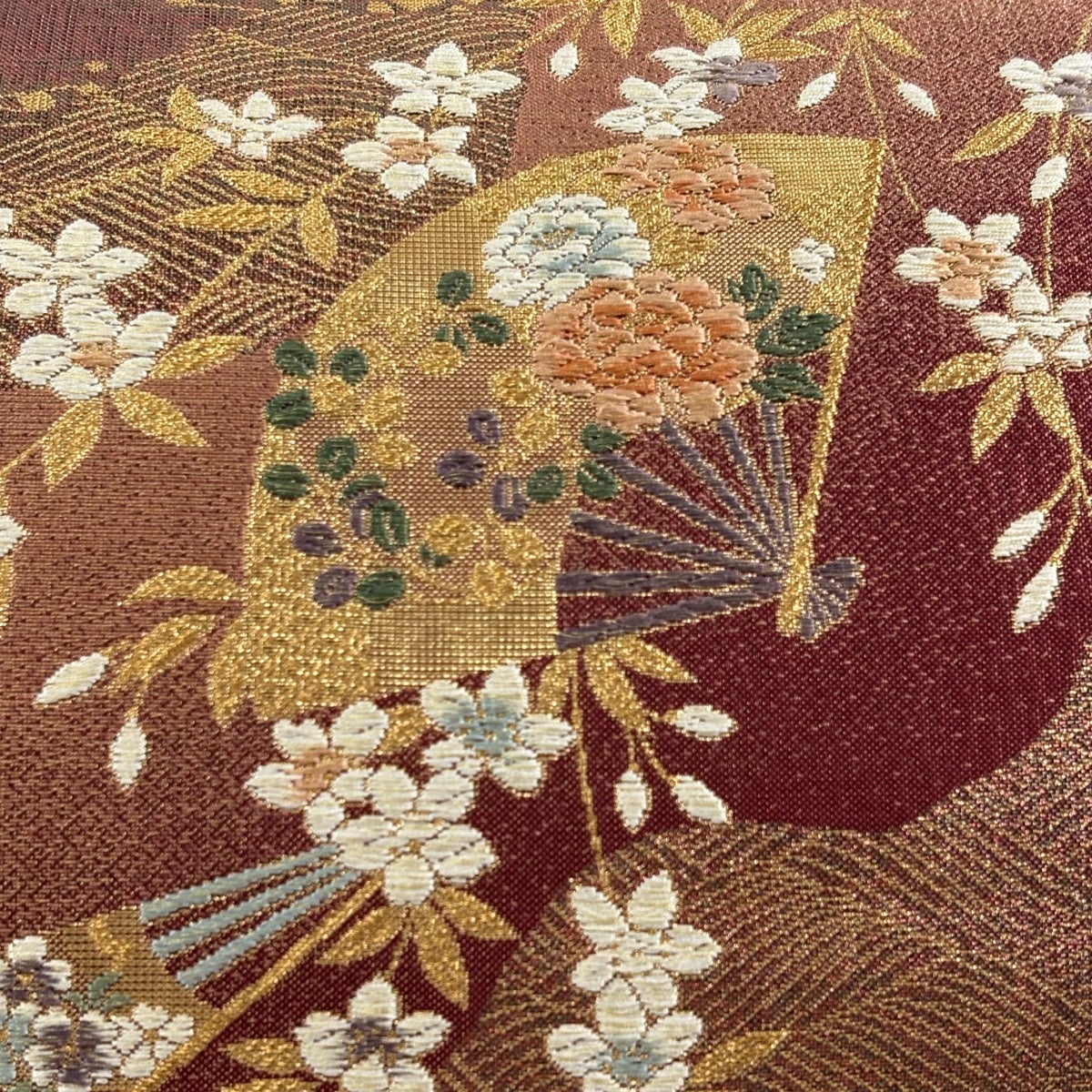 【美品】 袋帯 秀品 関西仕立て 扇 草花 箔 唐織 茶色 六通 正絹