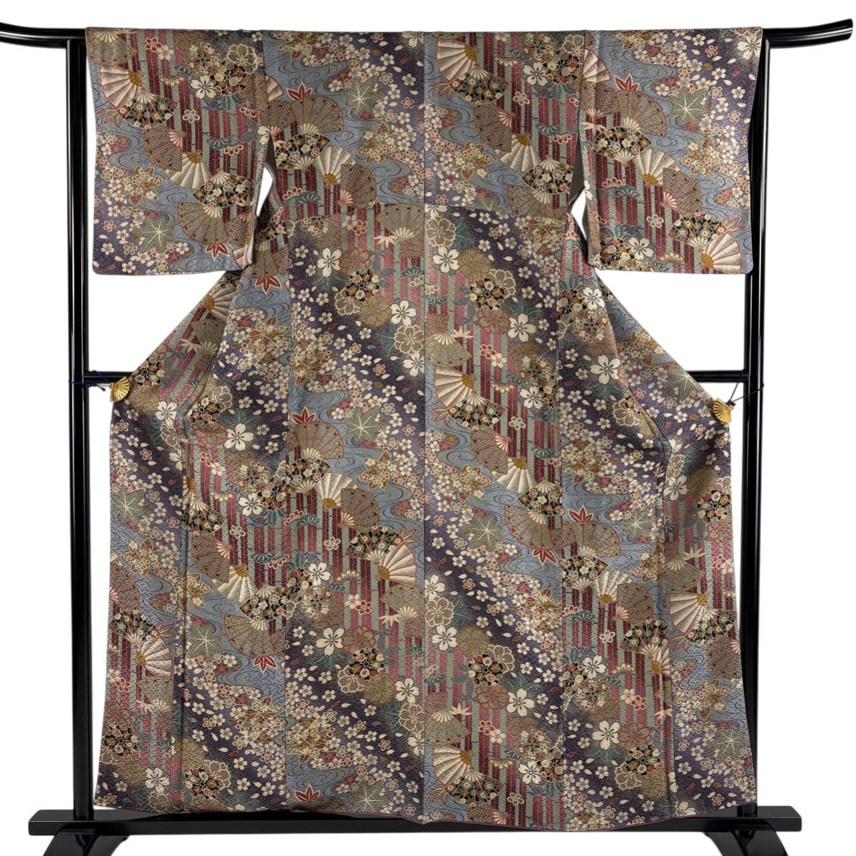訪問着 身丈162cm 裄丈64cm M 袷 扇 草花 金糸 金彩 青灰色 正絹 秀品