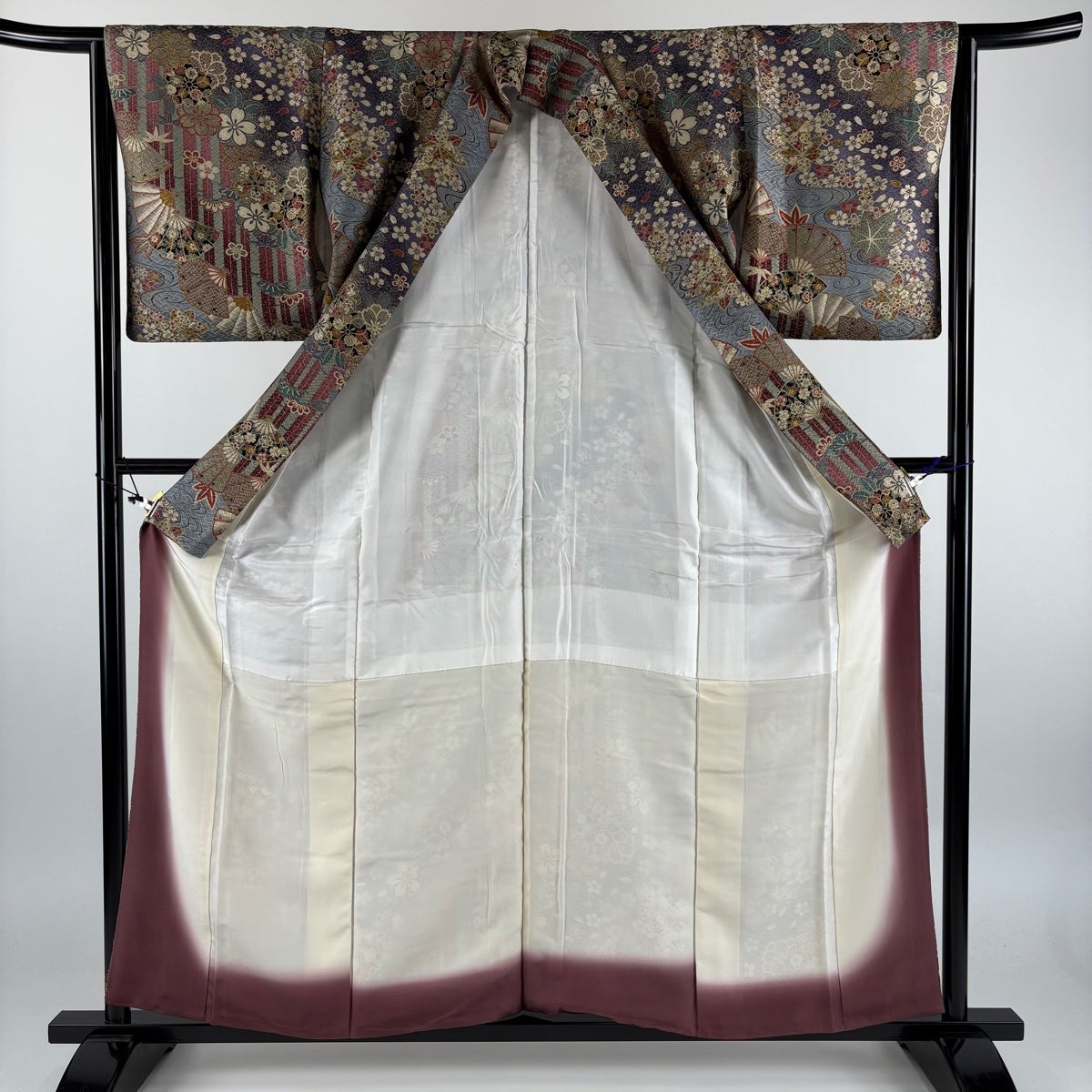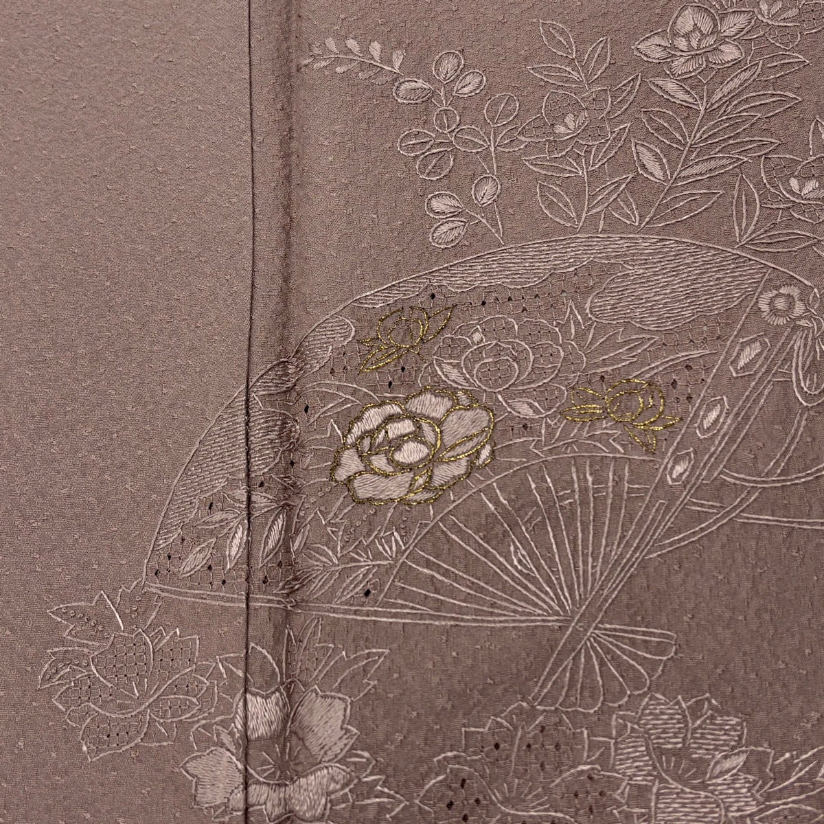 付下げ 身丈155.5cm 裄丈65cm M 袷 扇 草花 金糸 刺繍 灰紫 正絹 秀品