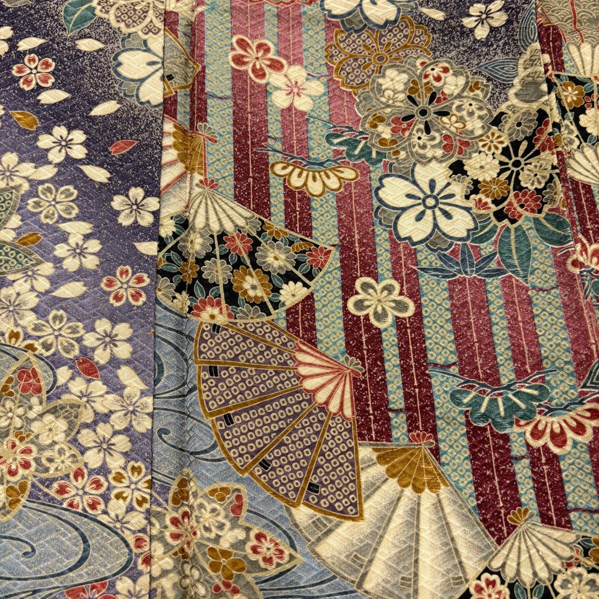 【美品】 小紋 身丈159cm 裄丈65cm M 袷 扇 桜 ぼかし 赤紫 正絹 秀品
