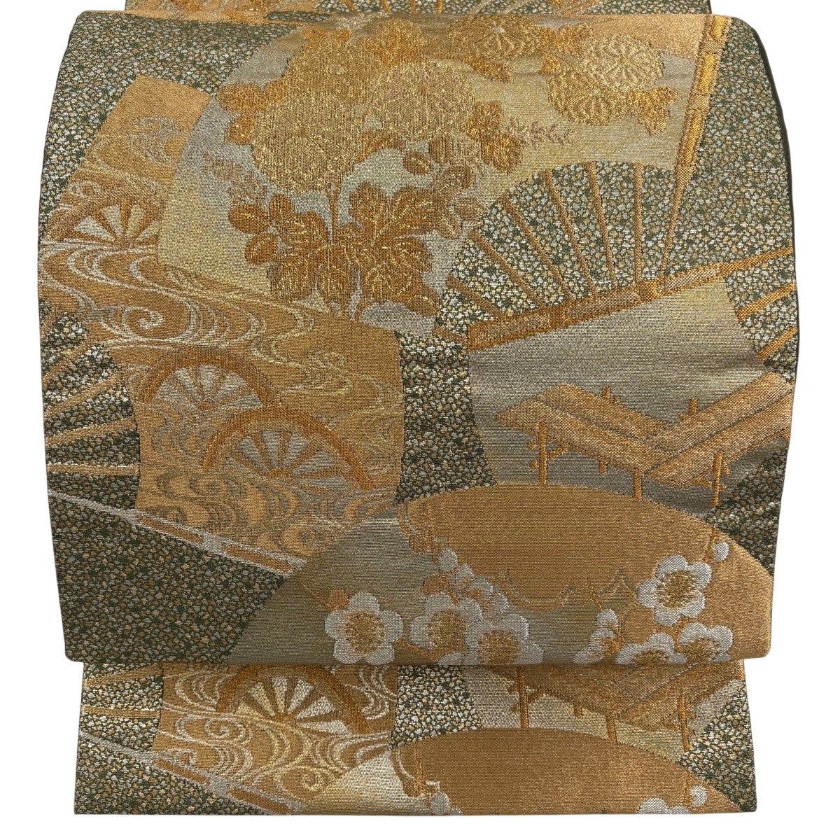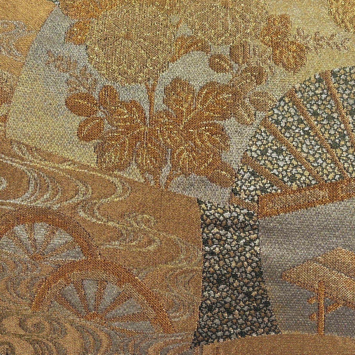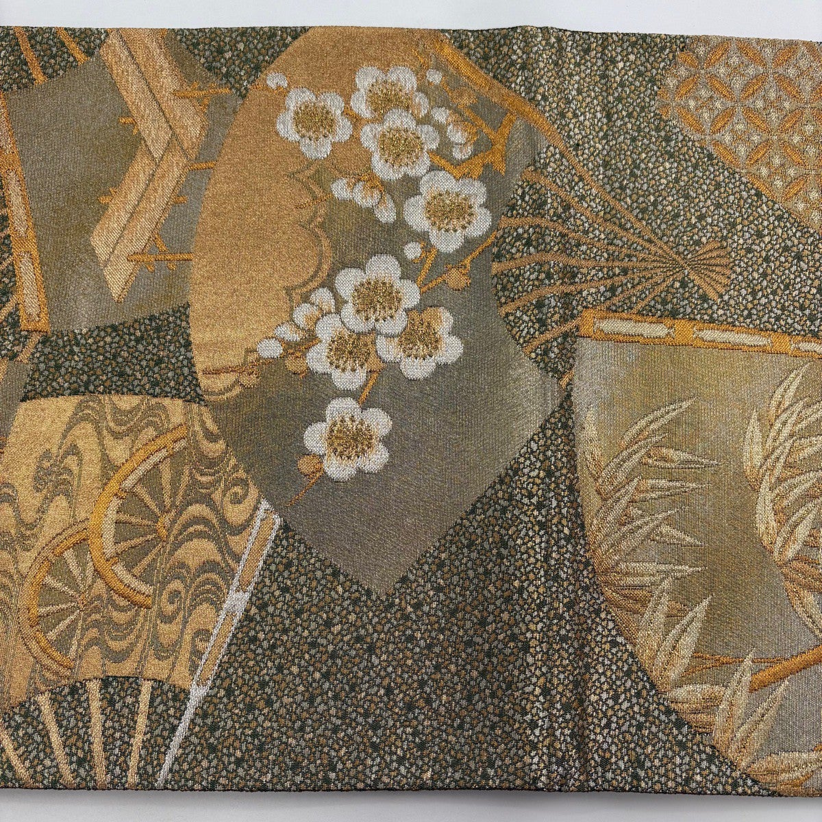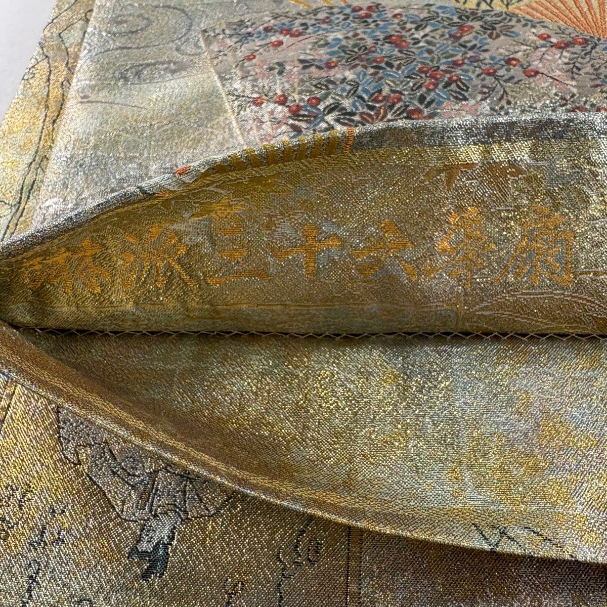【美品】 袋帯 秀品 じゅらく 落款あり 伯仙錦 扇 梅 金銀糸 箔 金色 六通 正絹