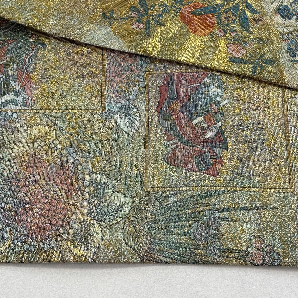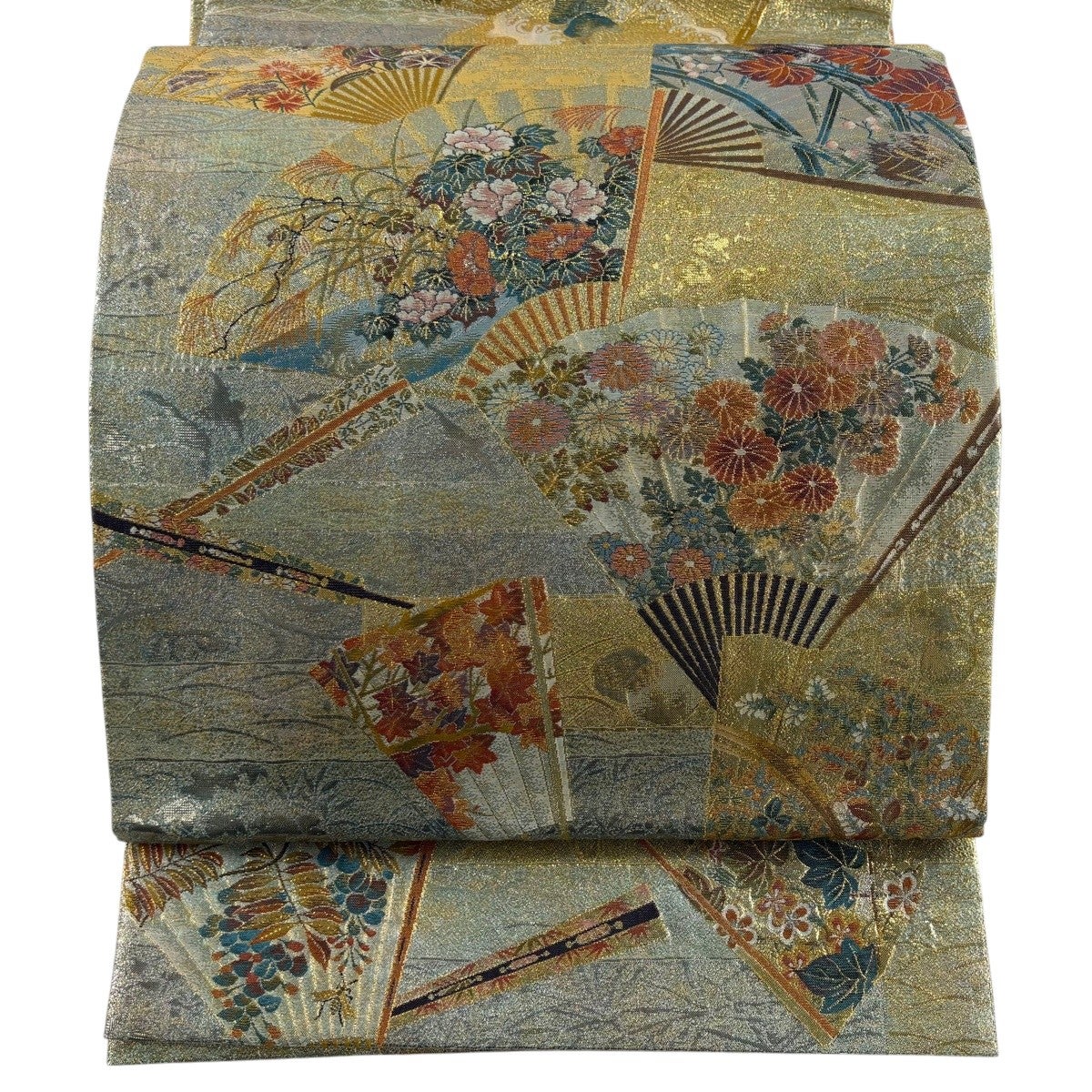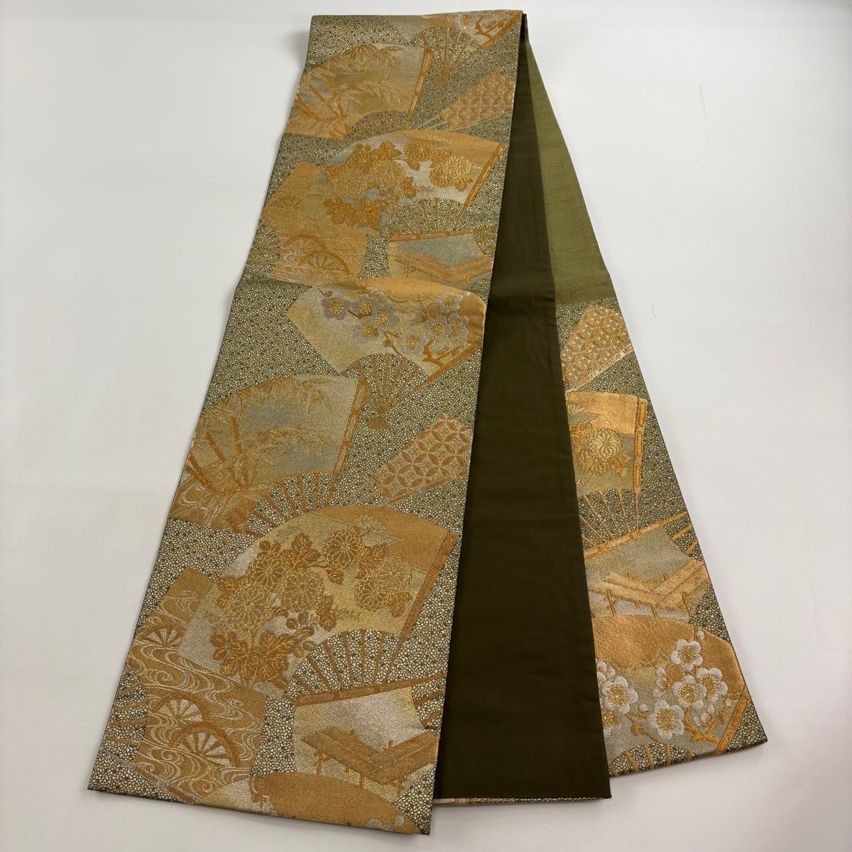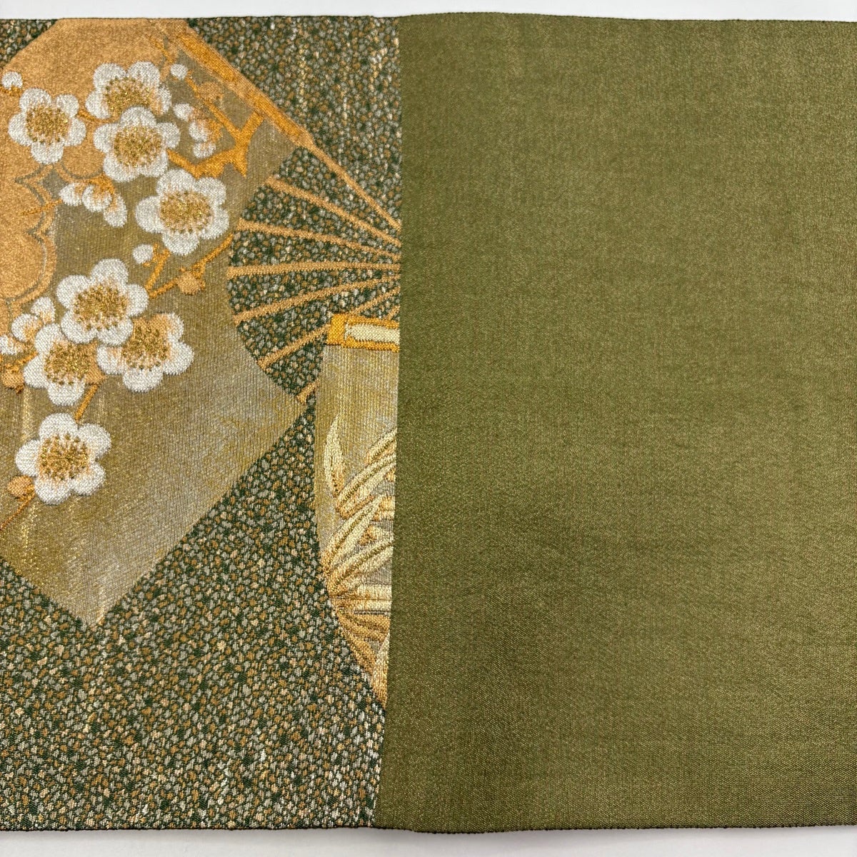 【美品】 袋帯 秀品 じゅらく 落款あり 伯仙錦 扇 梅 金銀糸 箔 金色 六通 正絹
