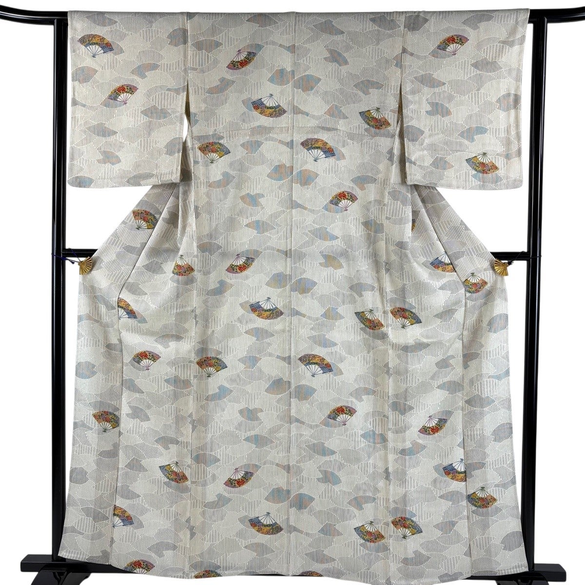 小紋 身丈166.5cm 裄丈68cm L 袷 扇 草花 紋意匠 灰色 正絹 名品