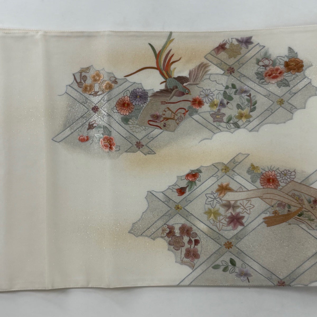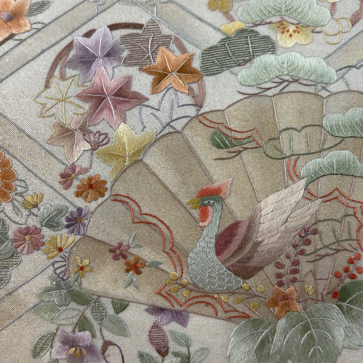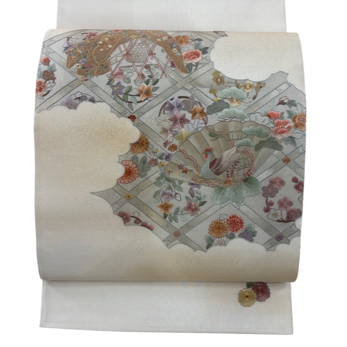 袋帯 逸品 じゅらく 落款あり じゅらく帝王紫 扇 草花 刺繍 金銀糸 ベージュ 六通 正絹