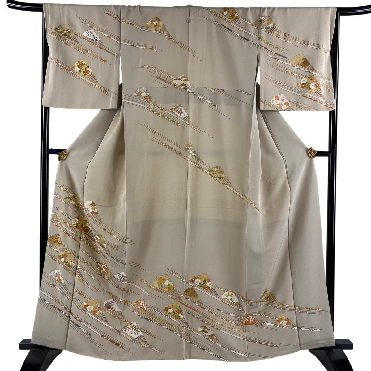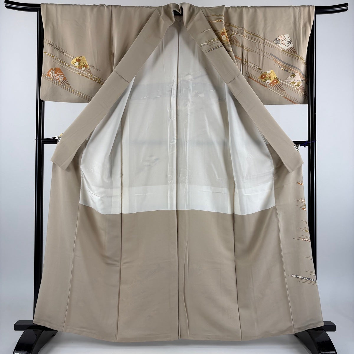 付下げ 身丈167cm 裄丈67cm M 袷 扇 草花 金銀彩 ぼかし ベージュ 正絹 優品