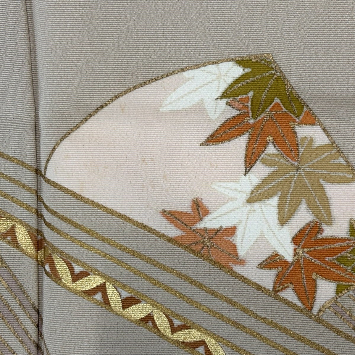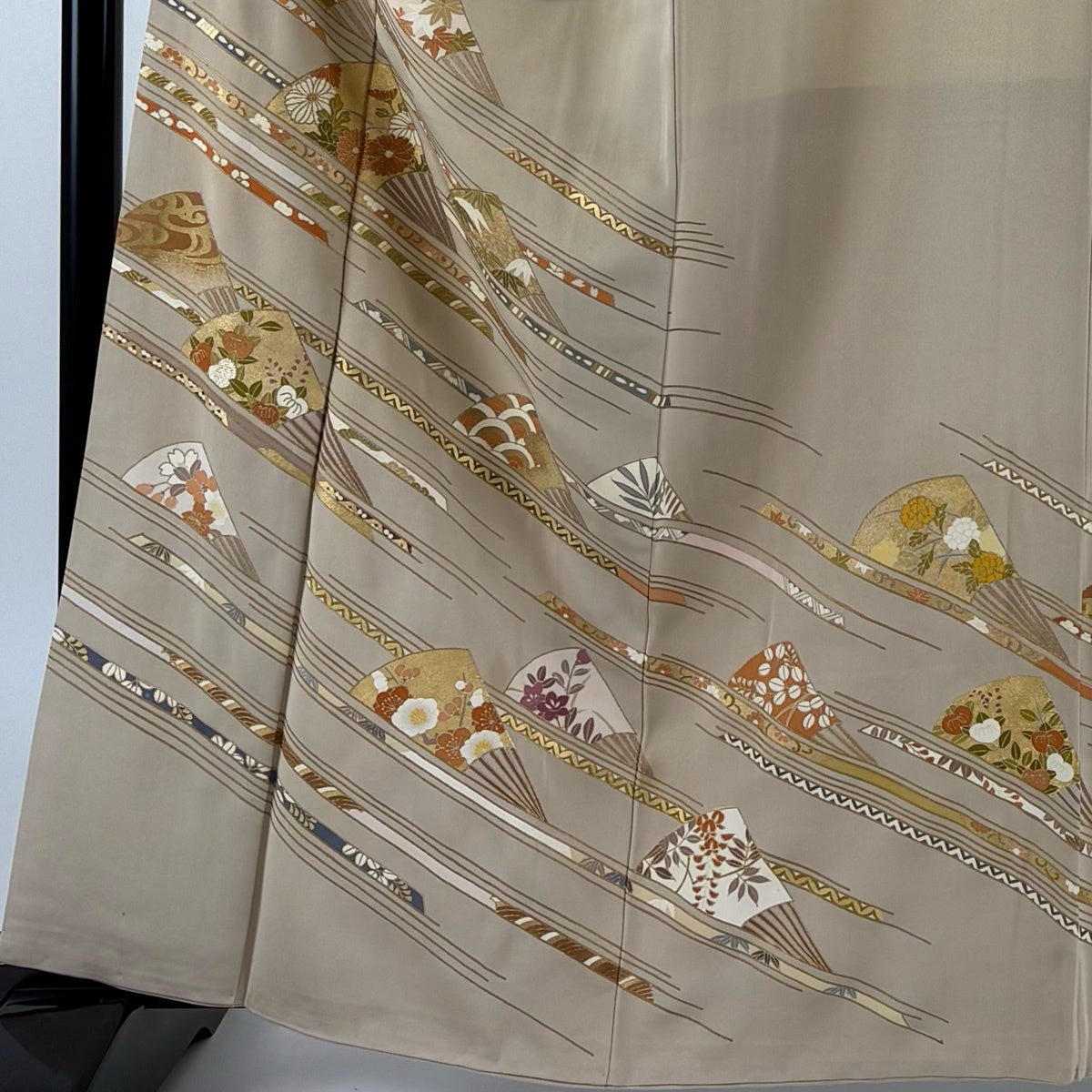 訪問着 身丈162.5cm 裄丈67.5cm L 袷 扇 草花 金彩 薄茶色 正絹 秀品 一つ紋