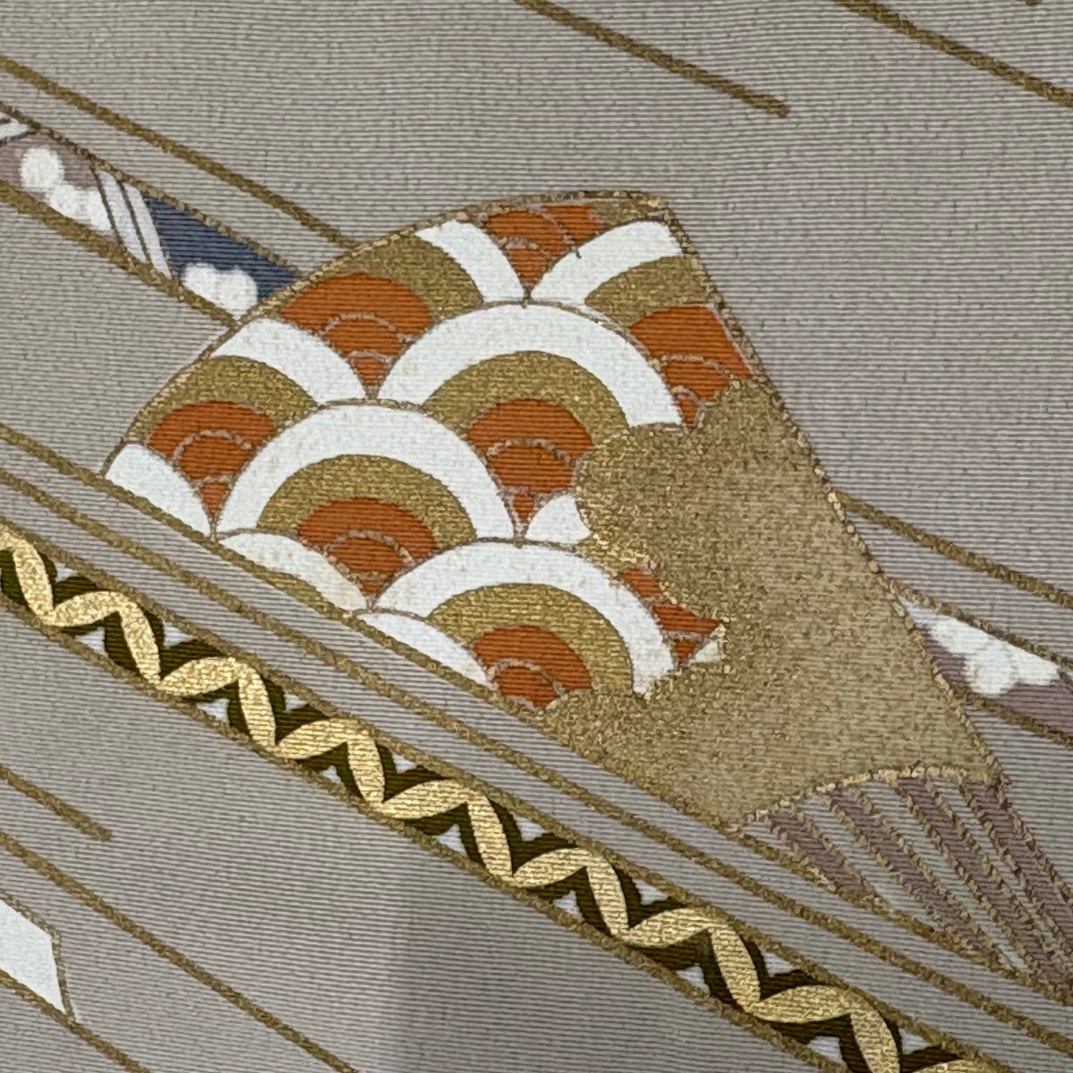【美品】 付下げ 身丈159cm 裄丈65cm M 袷 鶴 扇 金彩 ぼかし 灰茶 正絹 秀品