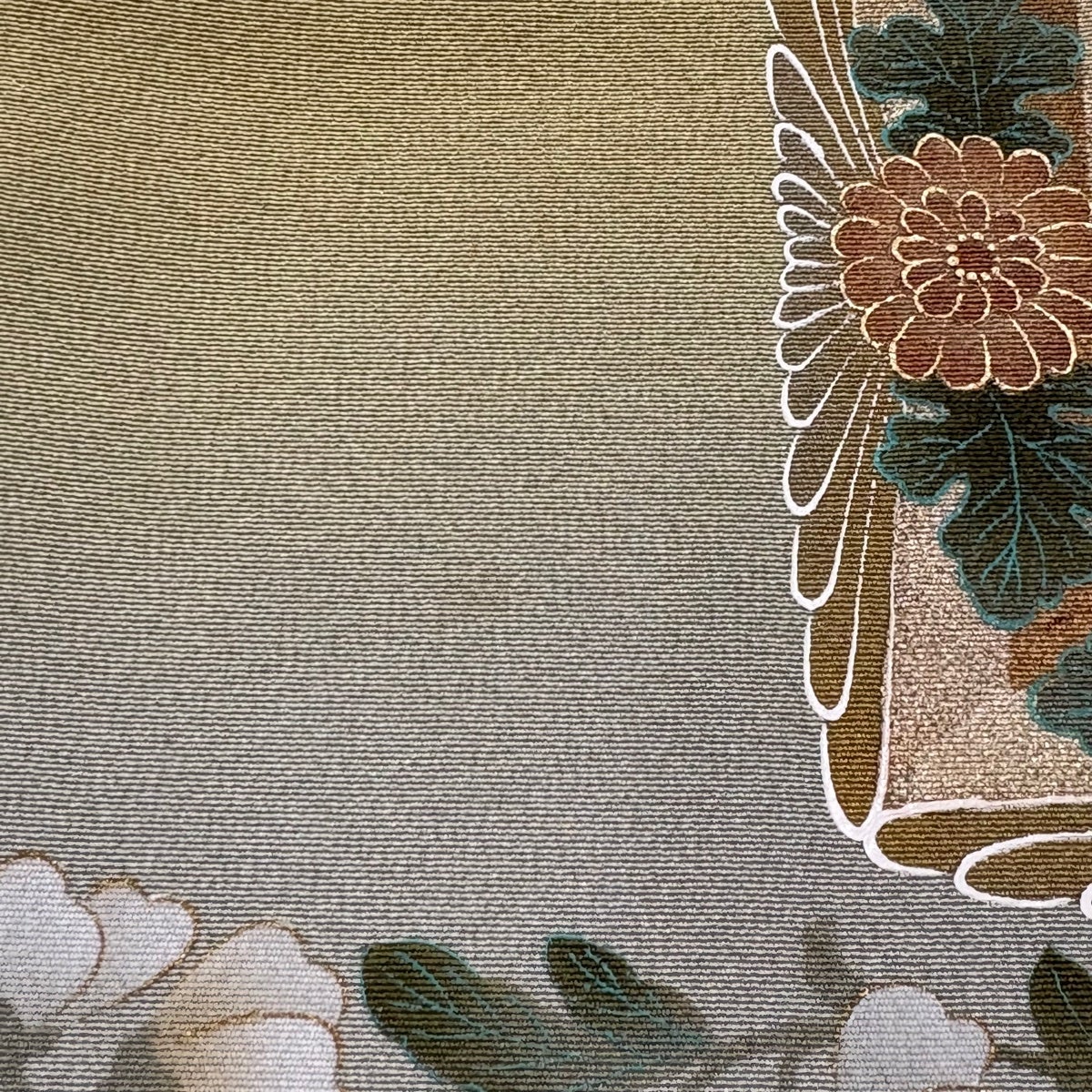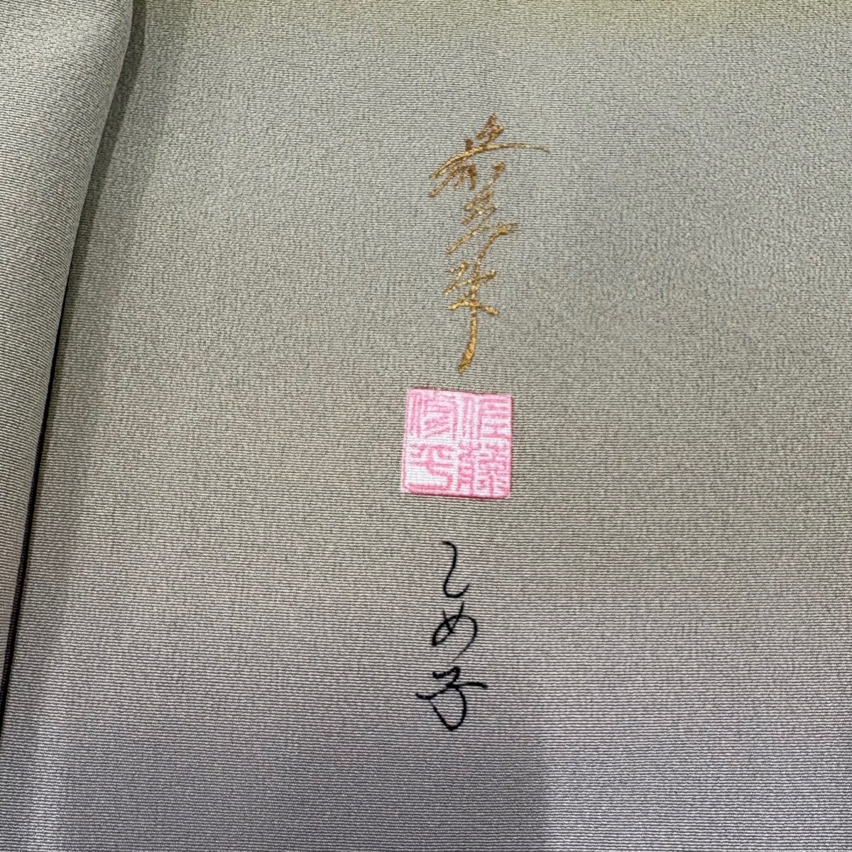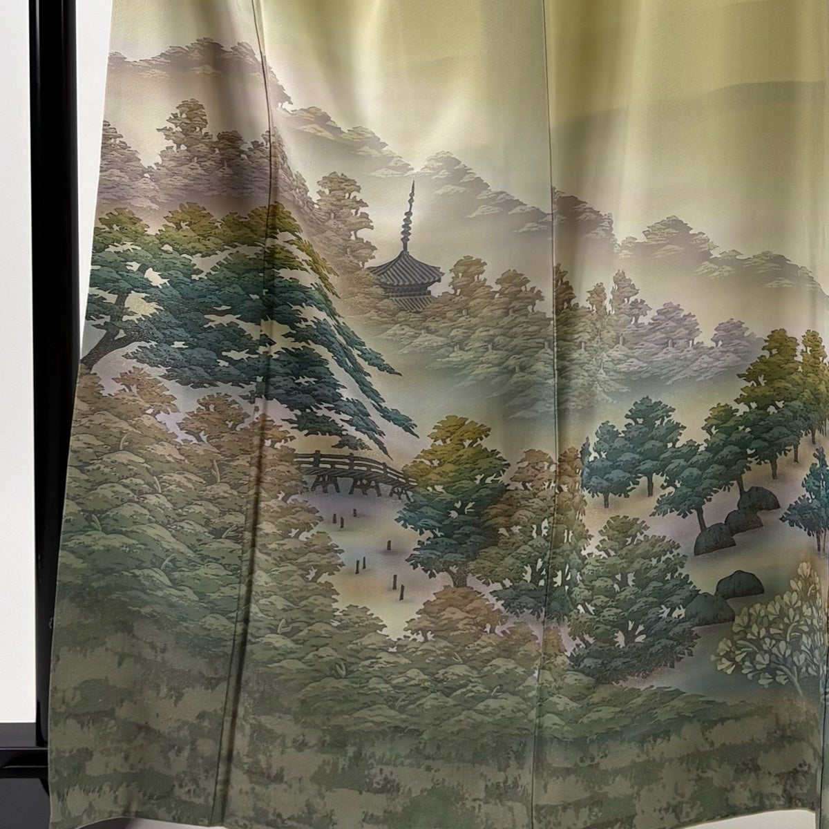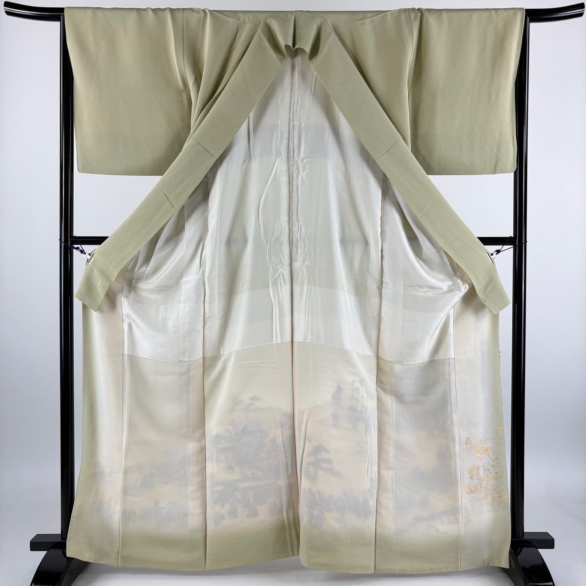 訪問着 身丈151.5cm 裄丈62.5cm S 袷 落款あり 鳥 草花 染め分け ぼかし 抹茶色 正絹 名品