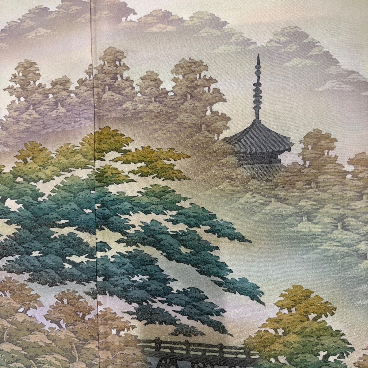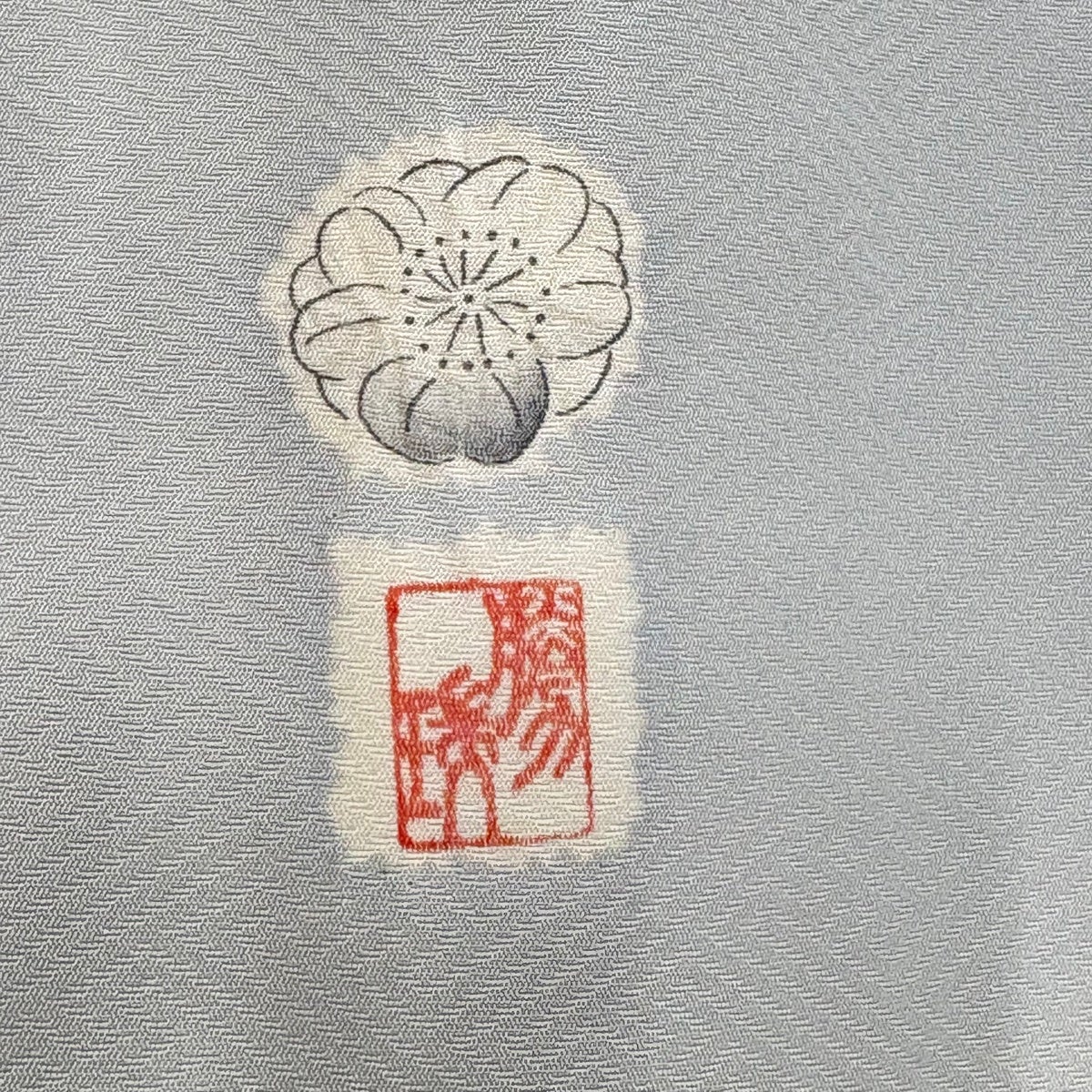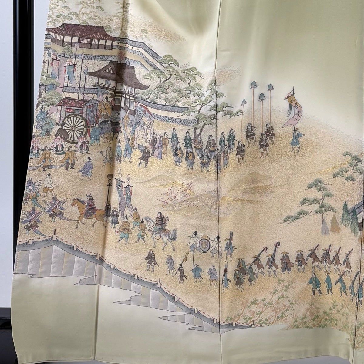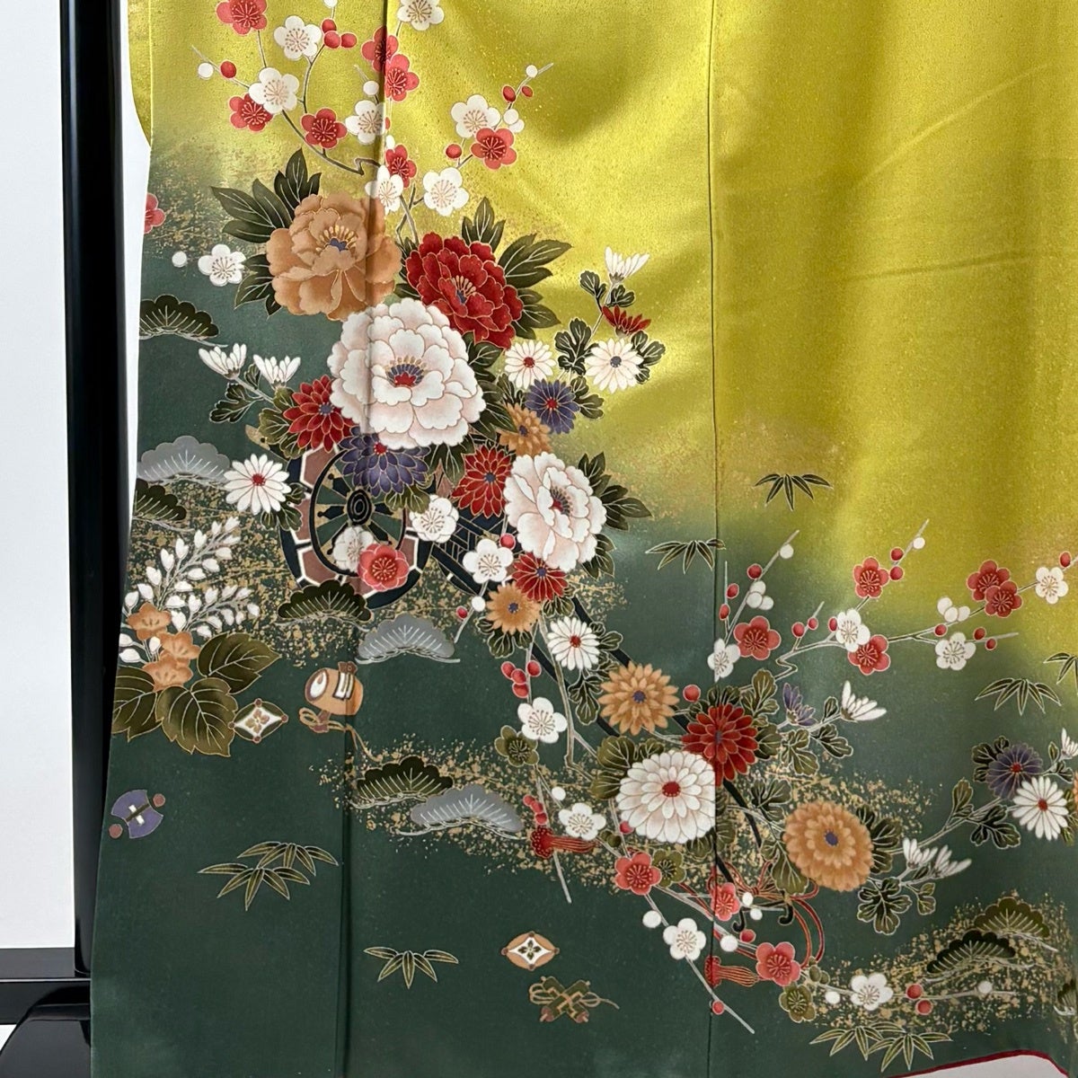 訪問着 身丈151.5cm 裄丈62.5cm S 袷 落款あり 鳥 草花 染め分け ぼかし 抹茶色 正絹 名品