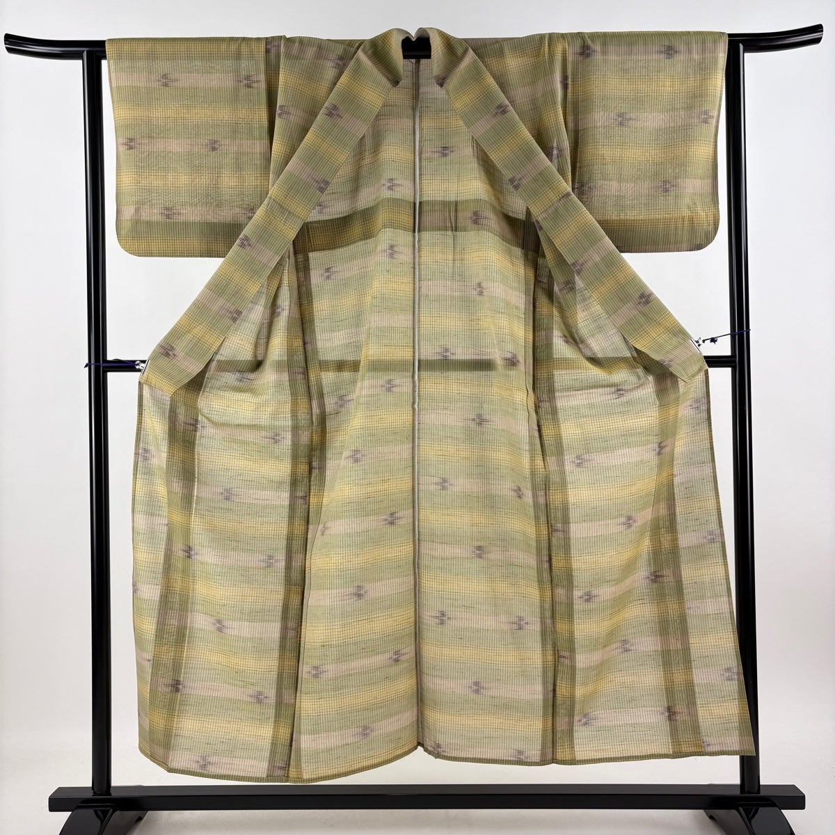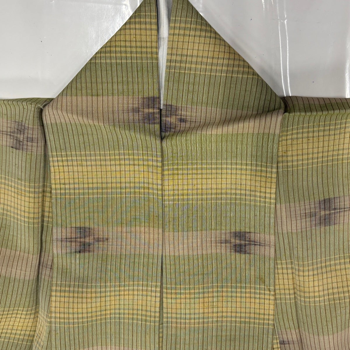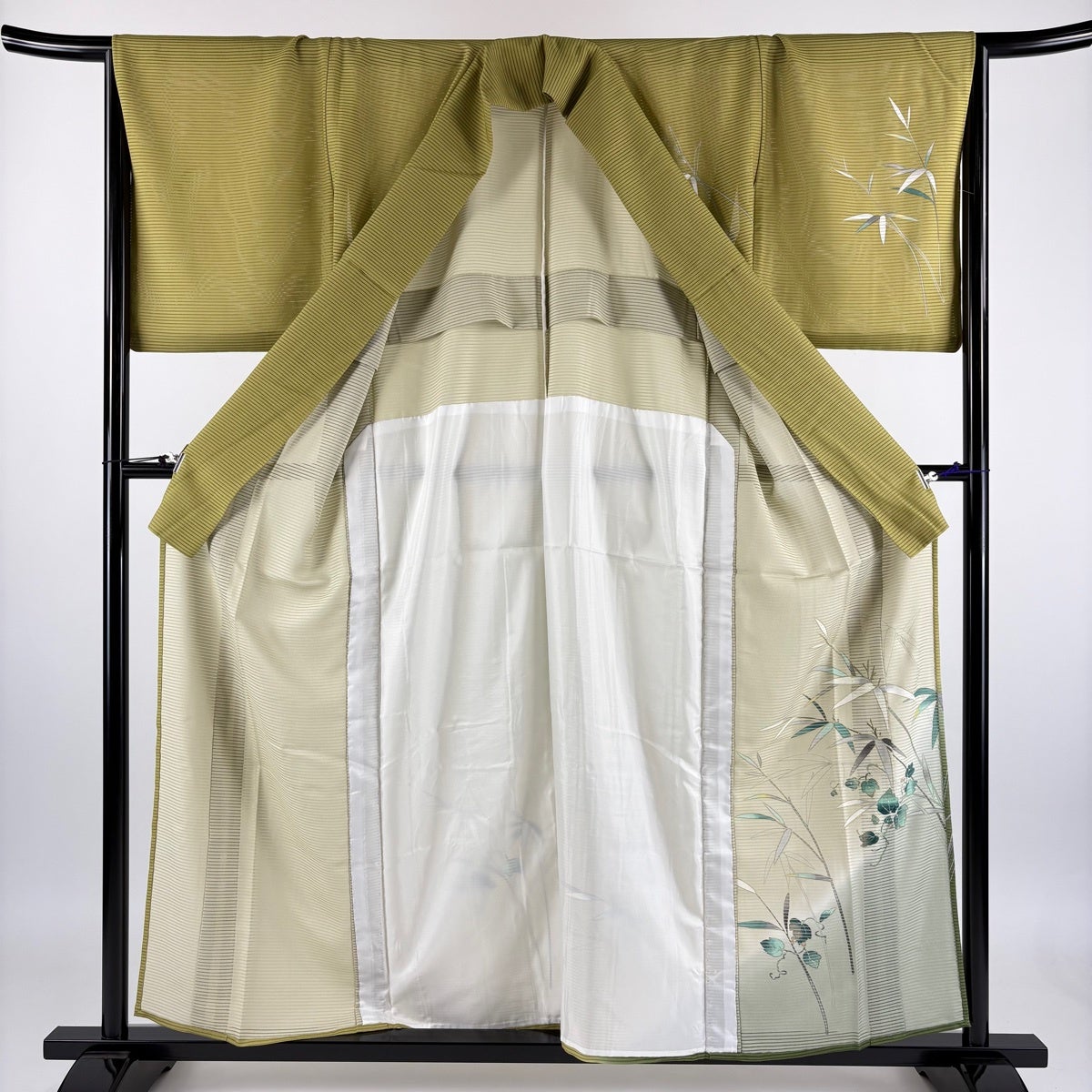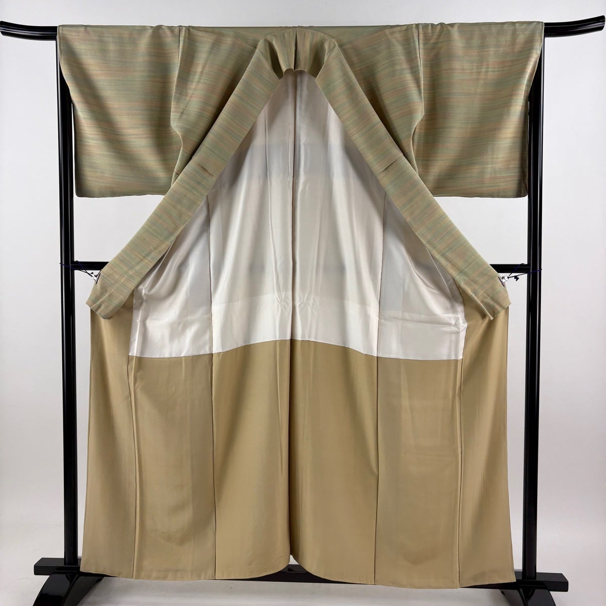 50%OFF 【美品】 小紋 身丈161.5cm 裄丈64.5cm M 単衣 縦縞 抹茶色 正絹 秀品 K50