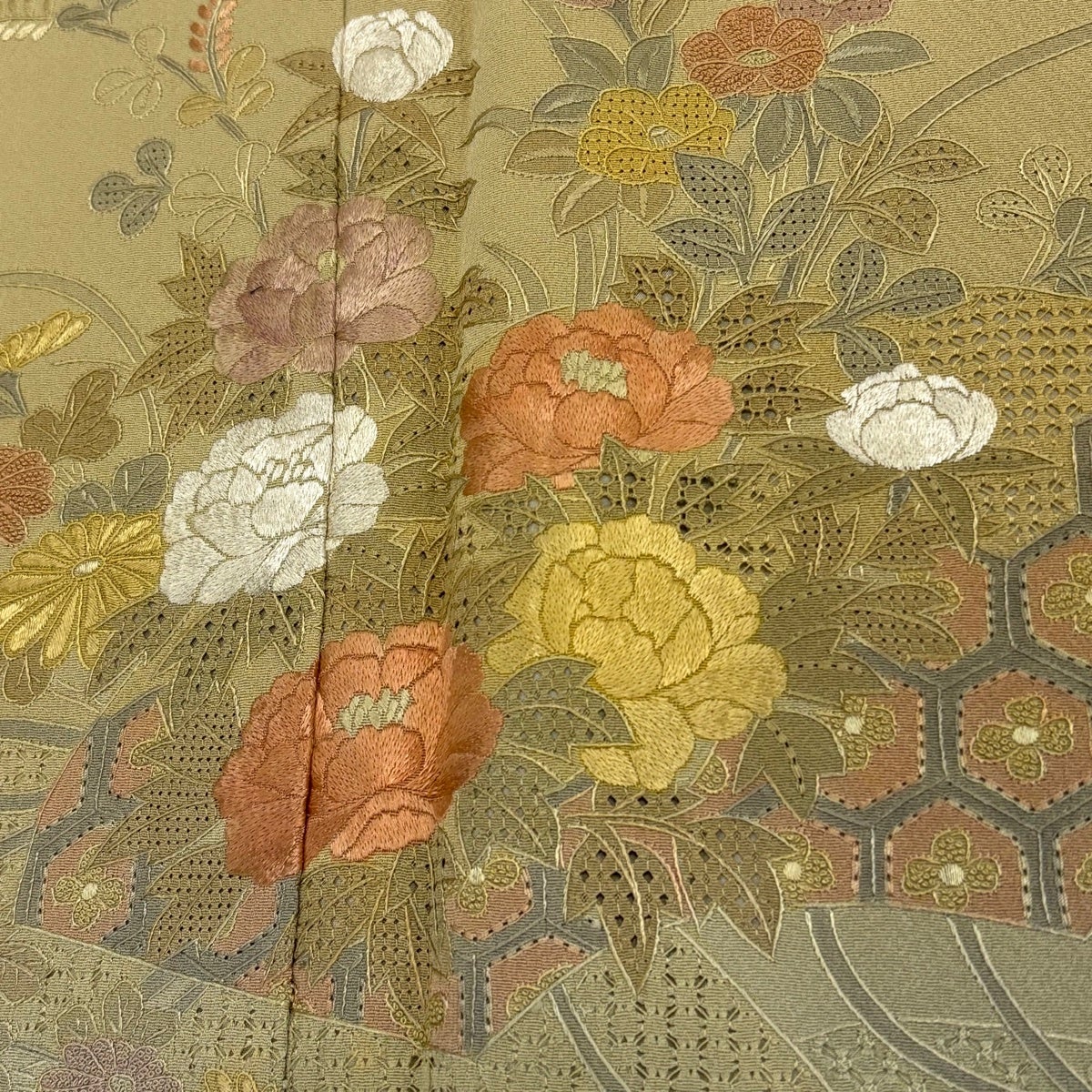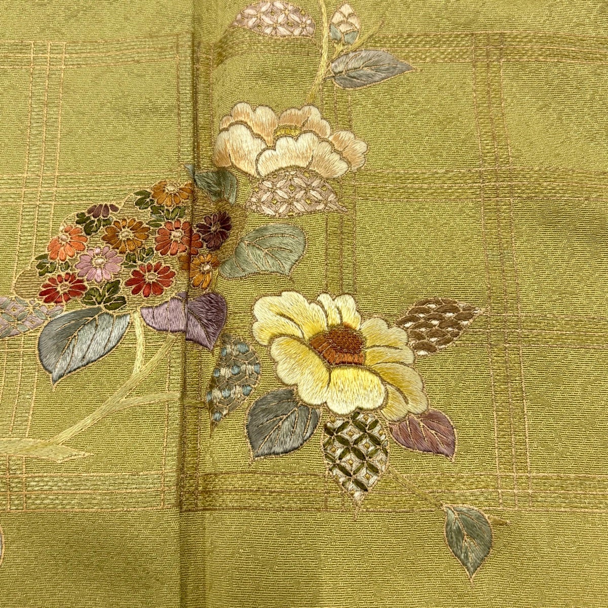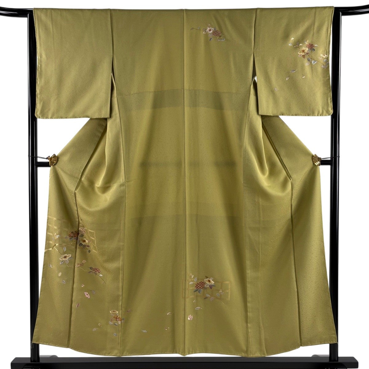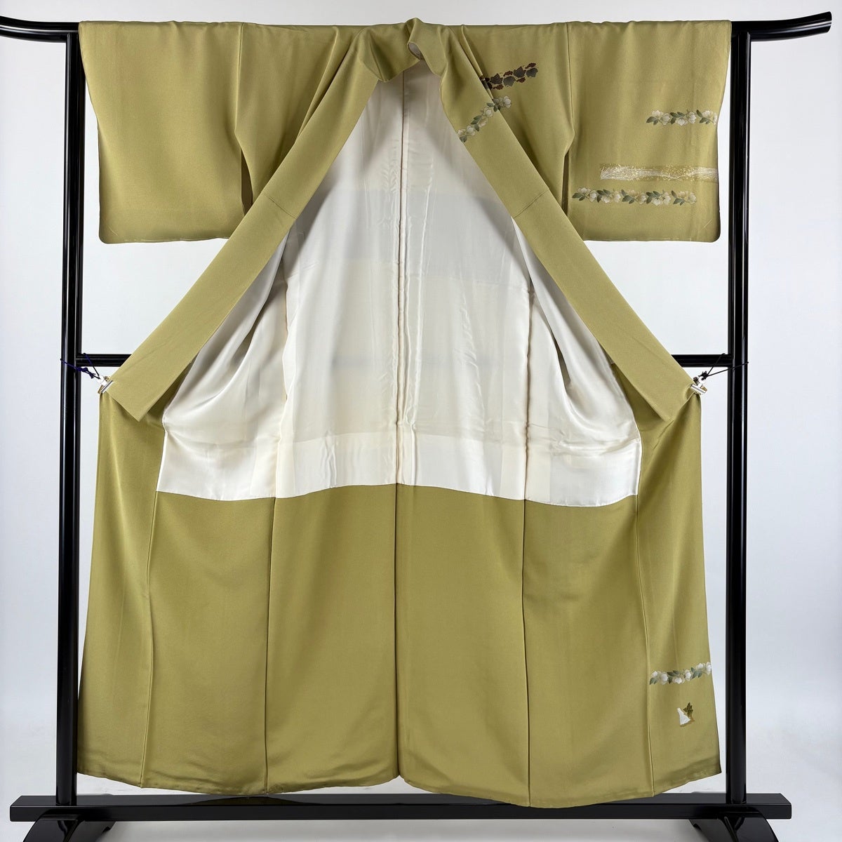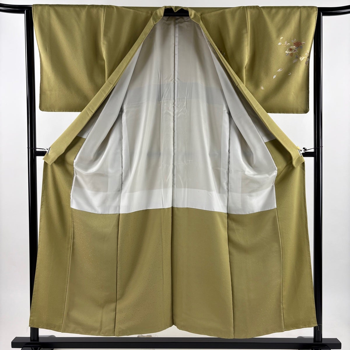 【美品】 訪問着 身丈153cm 裄丈64cm M 袷 バチ衿 枝花 葉 刺繍 金彩 抹茶色 正絹 秀品