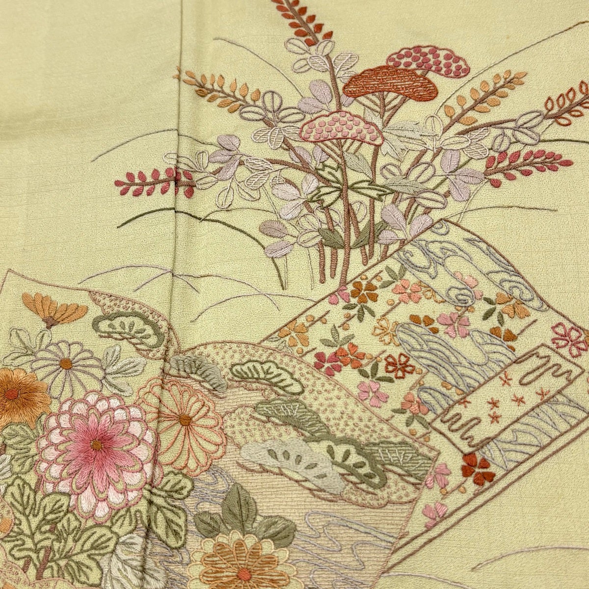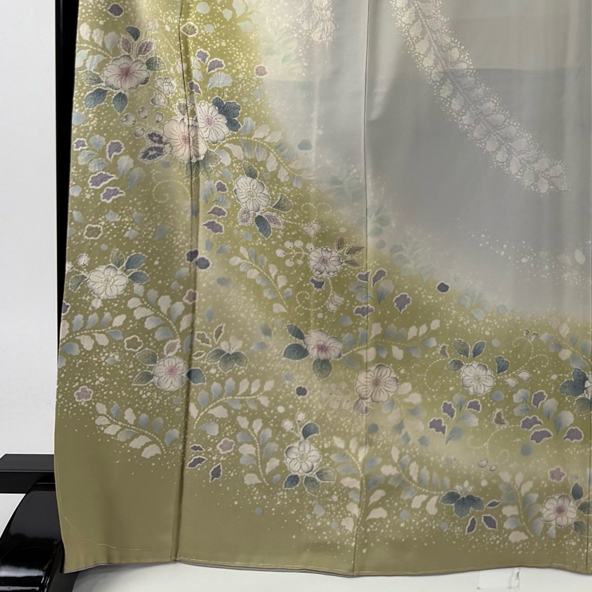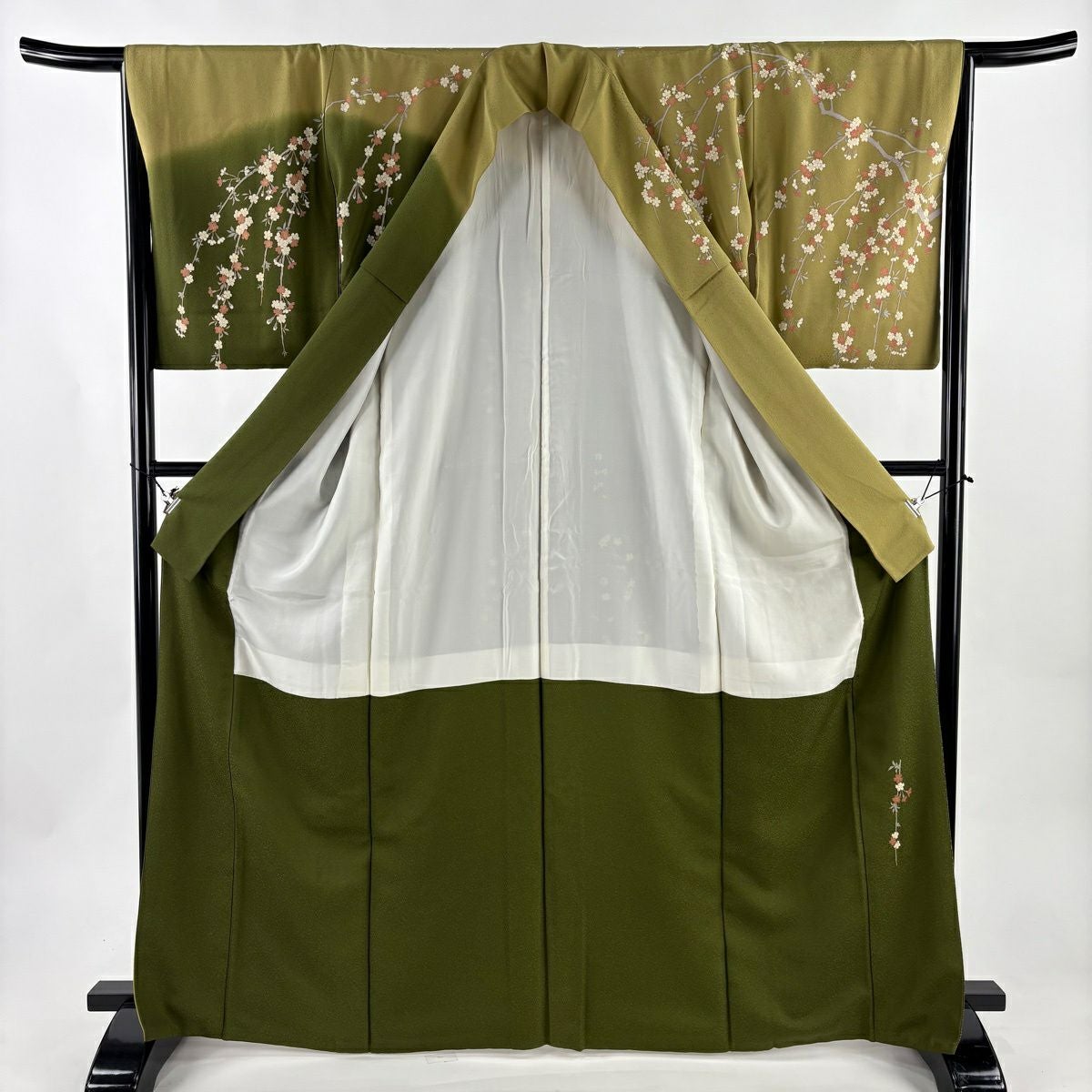 付下げ 身丈158cm 裄丈65.5cm M 単衣 バチ衿 冊子 草花 刺繍 裾ぼかし 抹茶色 正絹 秀品
