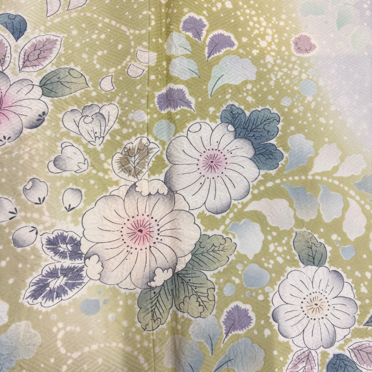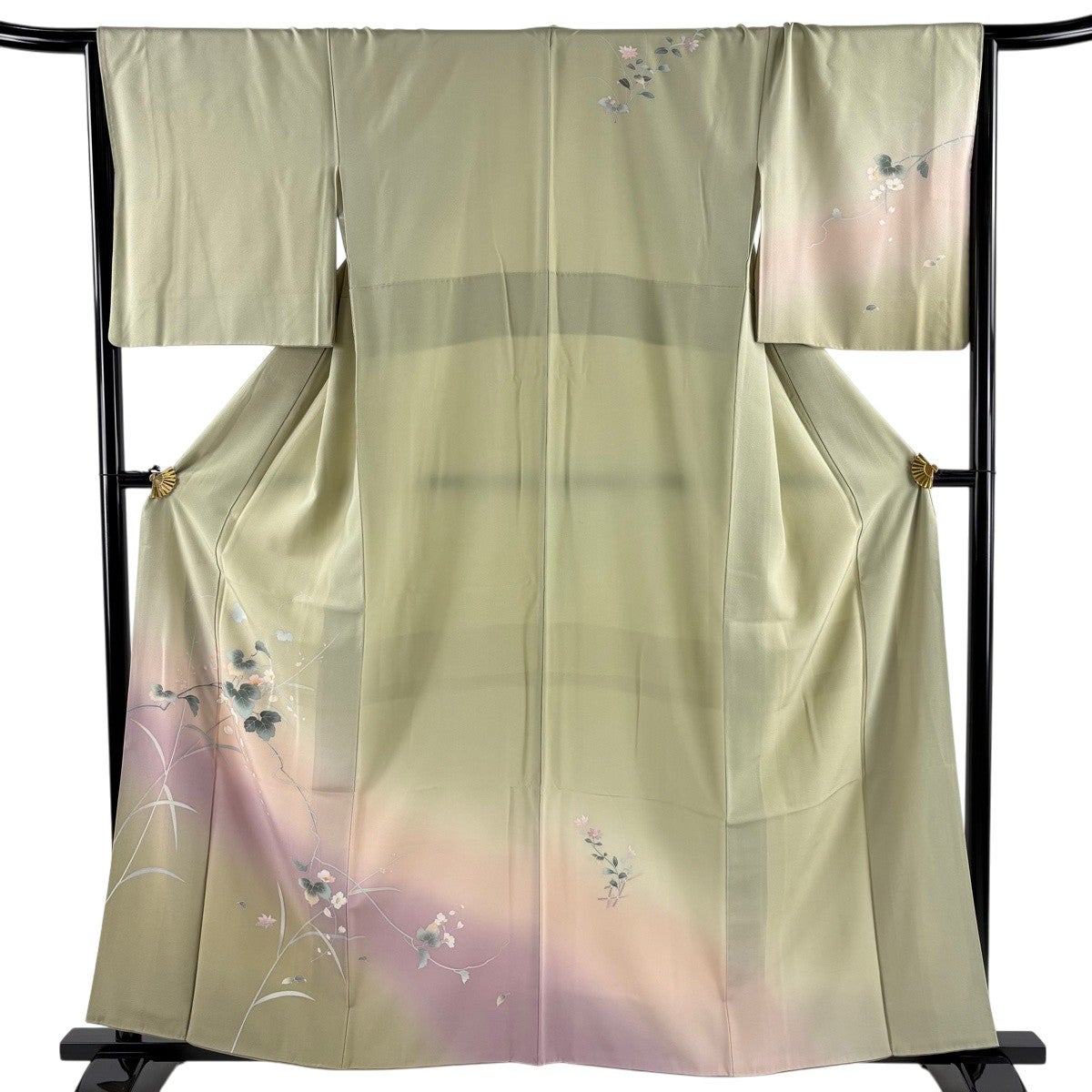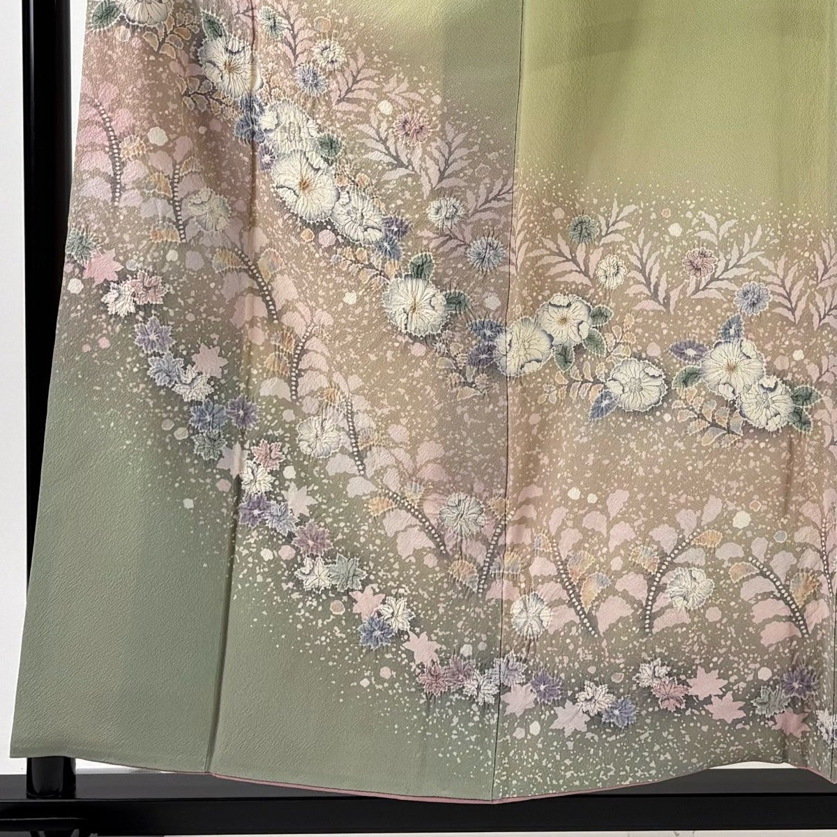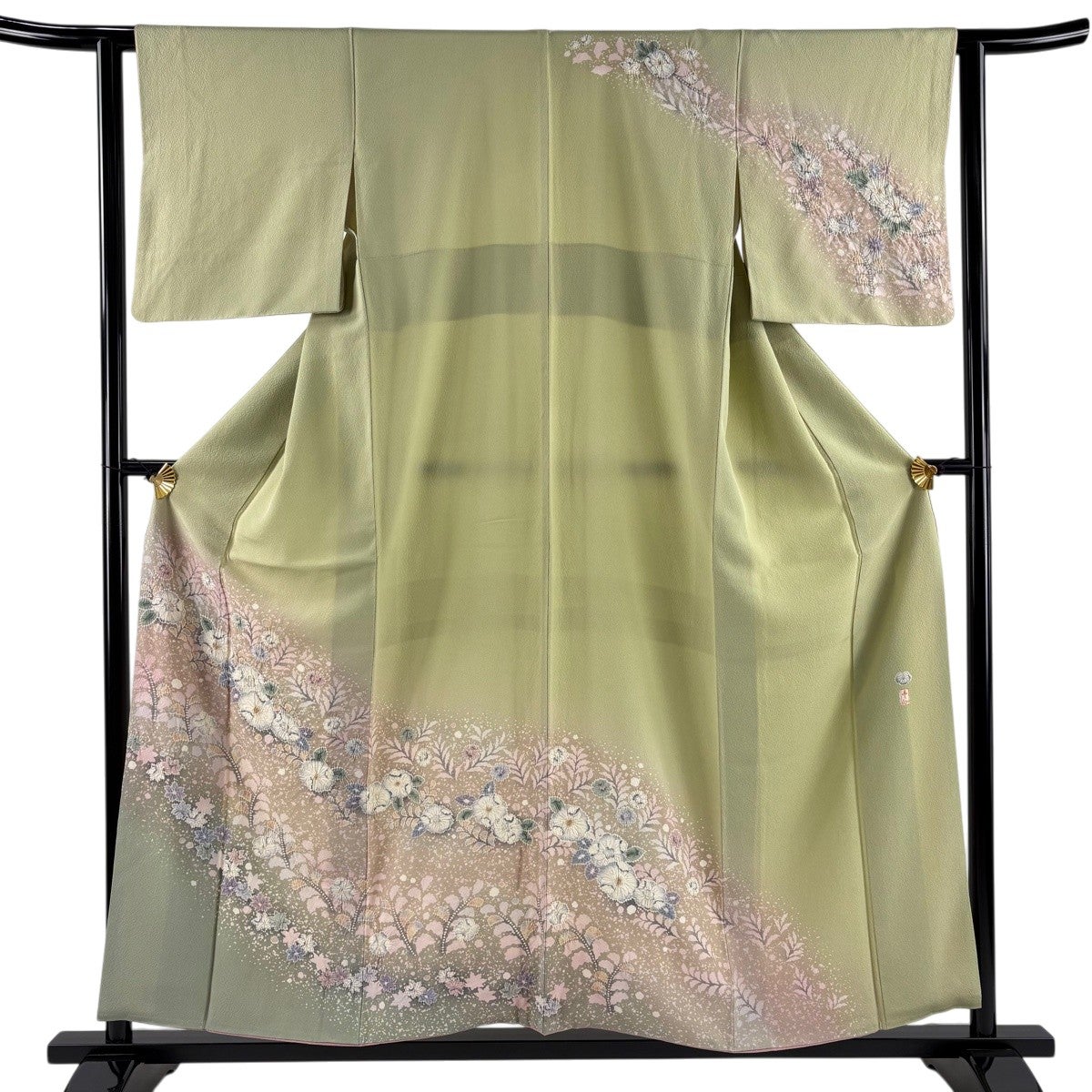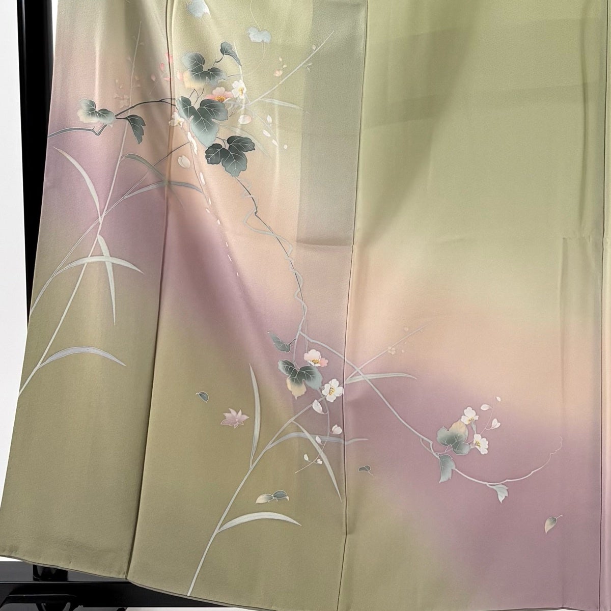 70%OFF 付下げ 身丈157cm 裄丈65cm M 袷 枝花 草花 ぼかし 抹茶色 正絹 秀品 K70