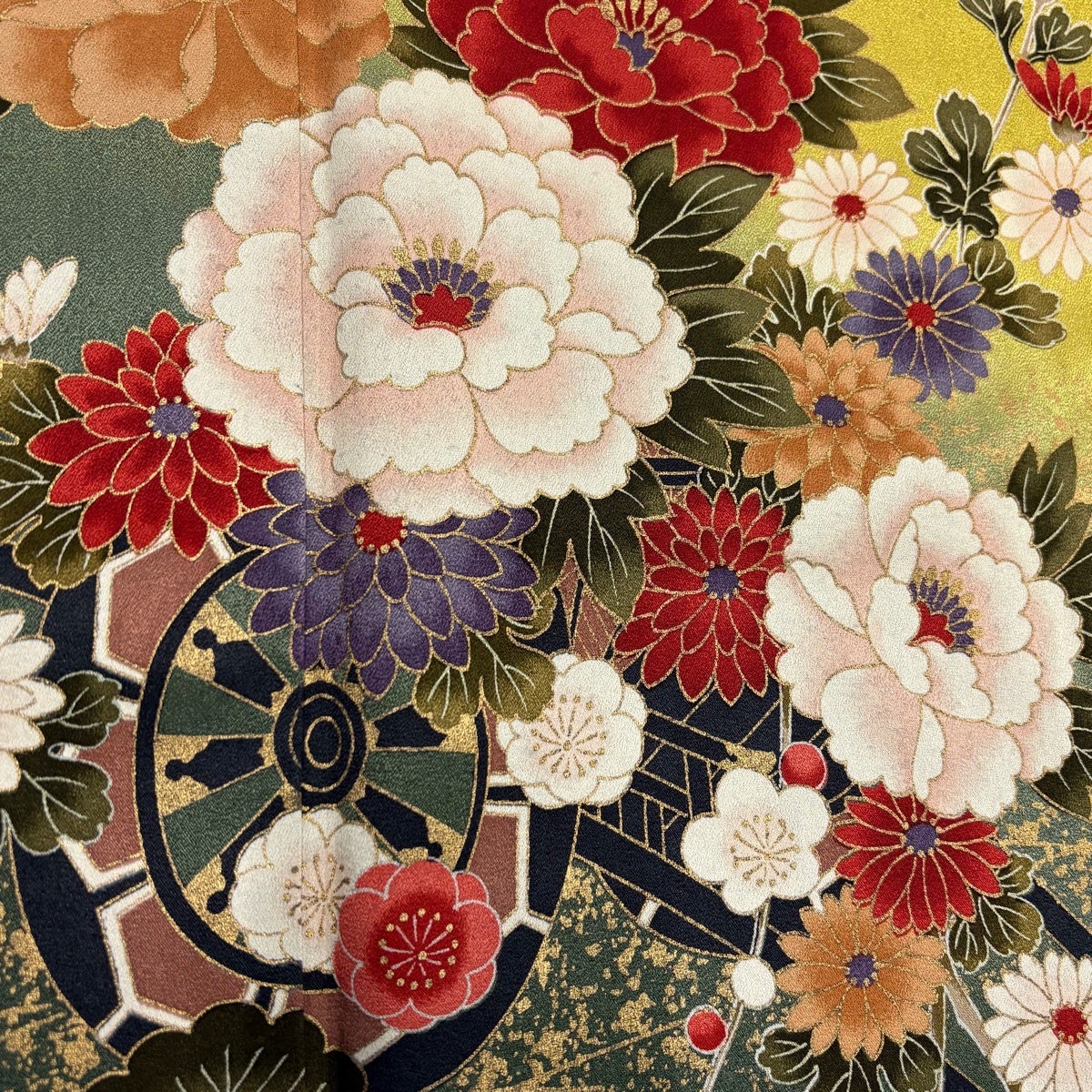 70%OFF 訪問着 身丈163cm 裄丈64cm M 袷 橘花 桜 絞り 刺繍 抹茶色 正絹 秀品 K70