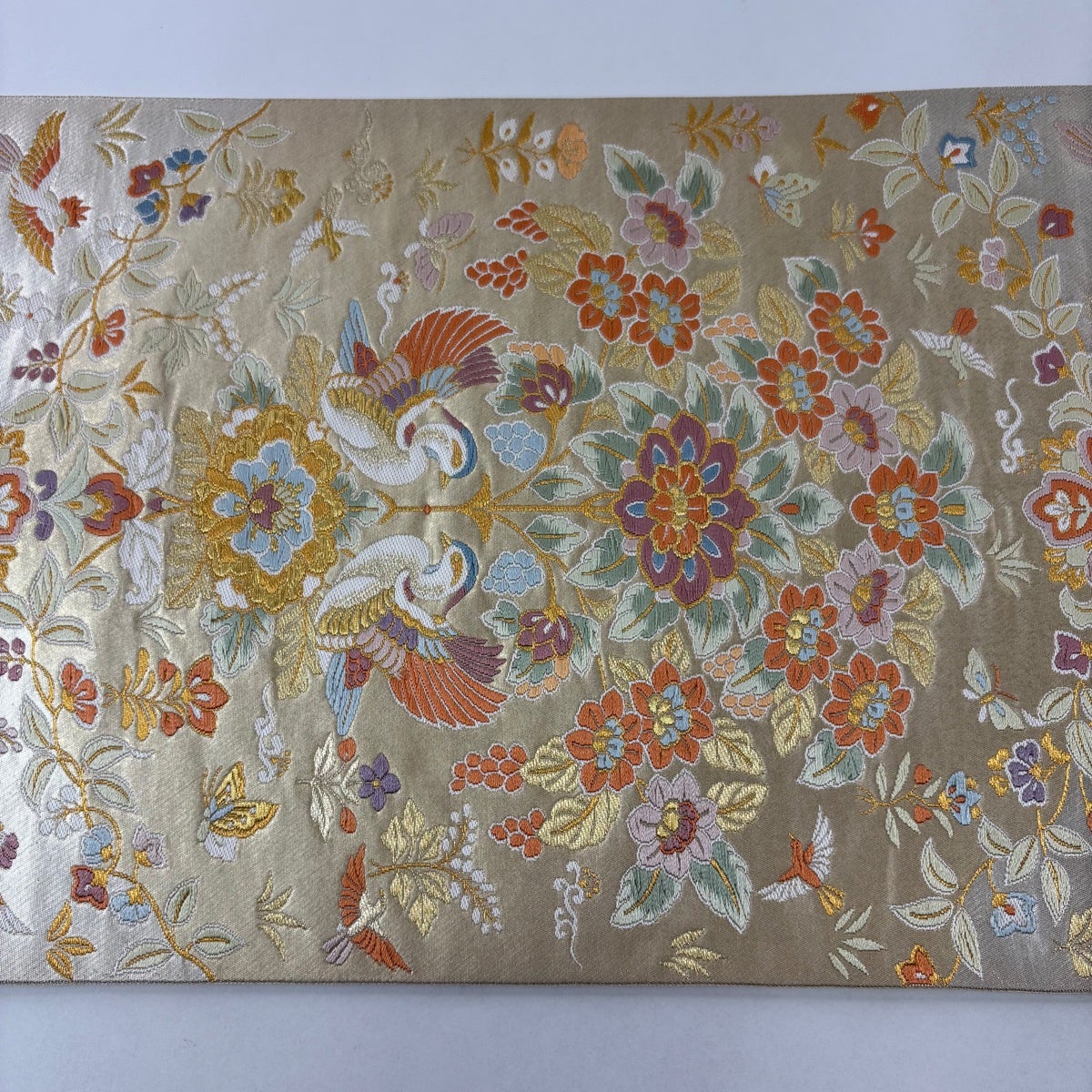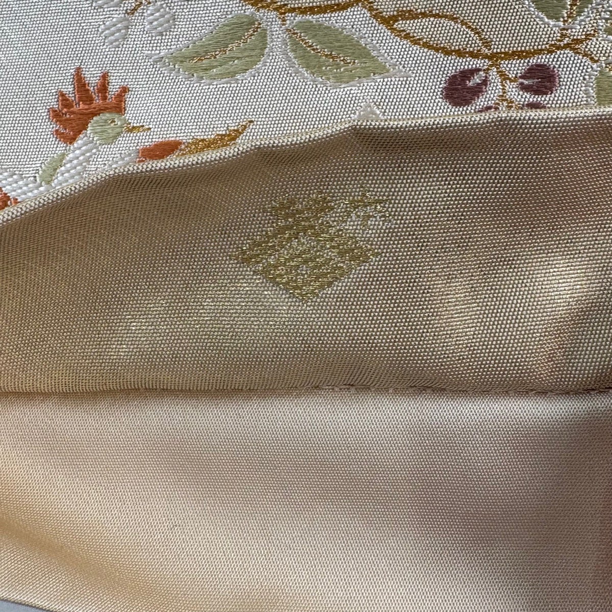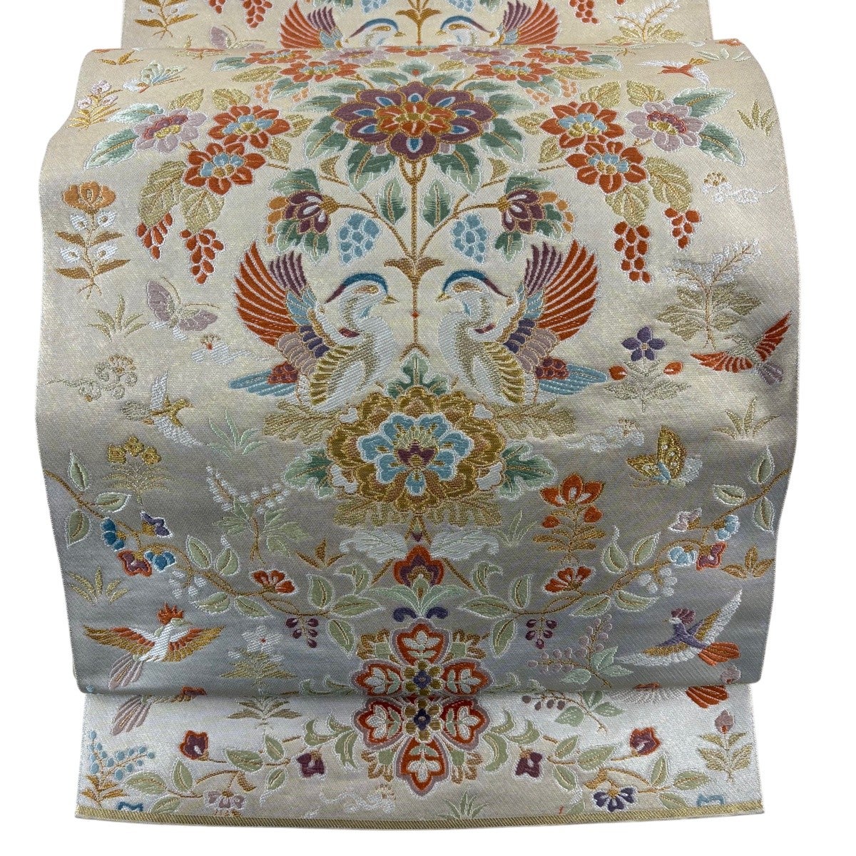 【美品】 袋帯 逸品 川島織物 落款あり 関西仕立て 向鳥 草花 金銀糸 箔 ベージュ 六通 正絹