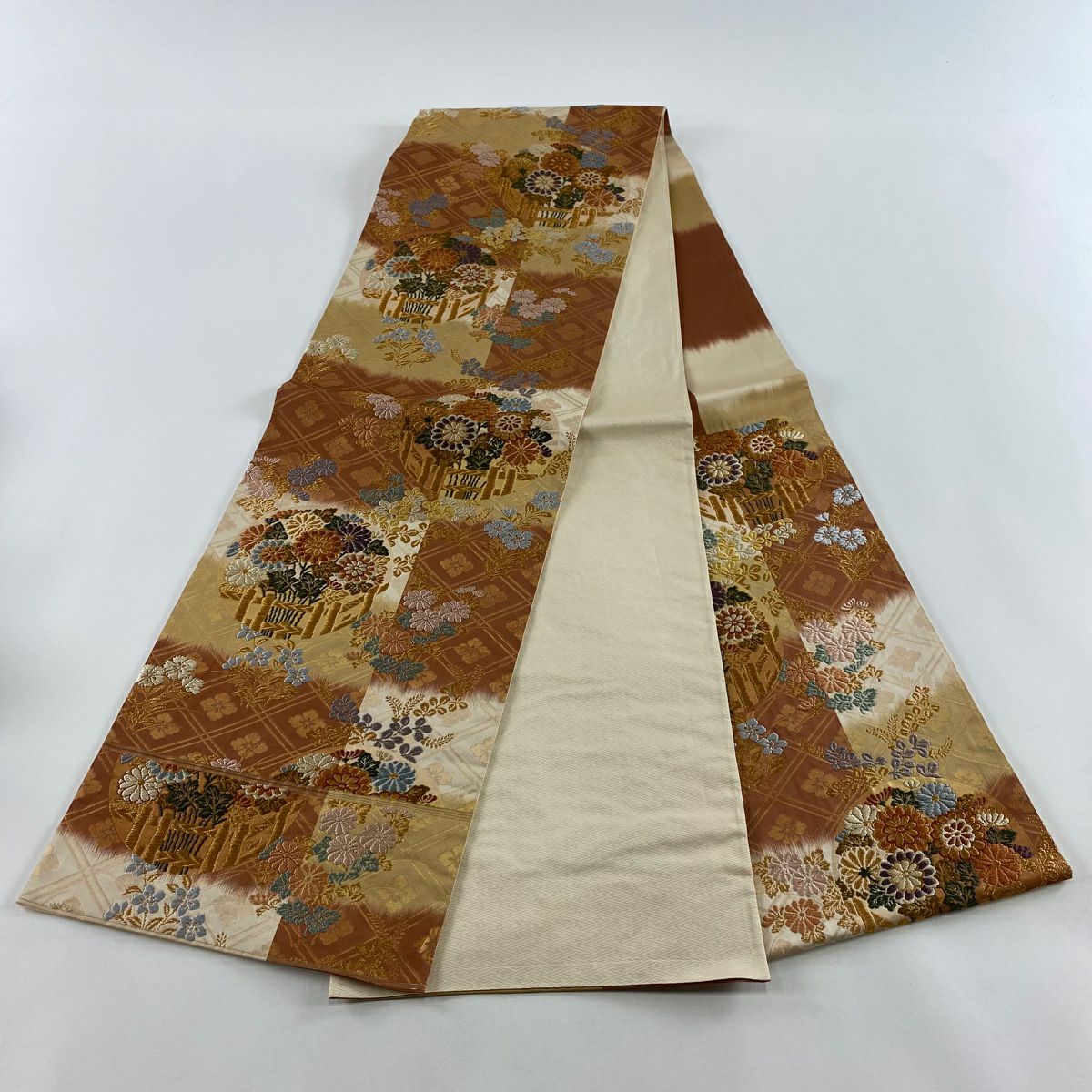【美品】 袋帯 名品 関西仕立て 七宝 花菱 金糸 箔 クリーム 六通 正絹