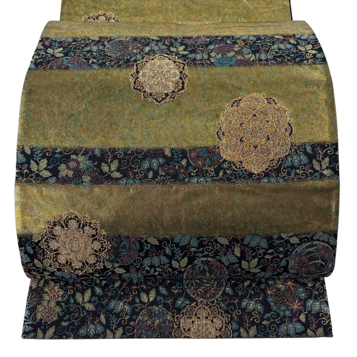 袋帯 秀品 華文 花唐草 金糸 箔 薄緑 六通 正絹