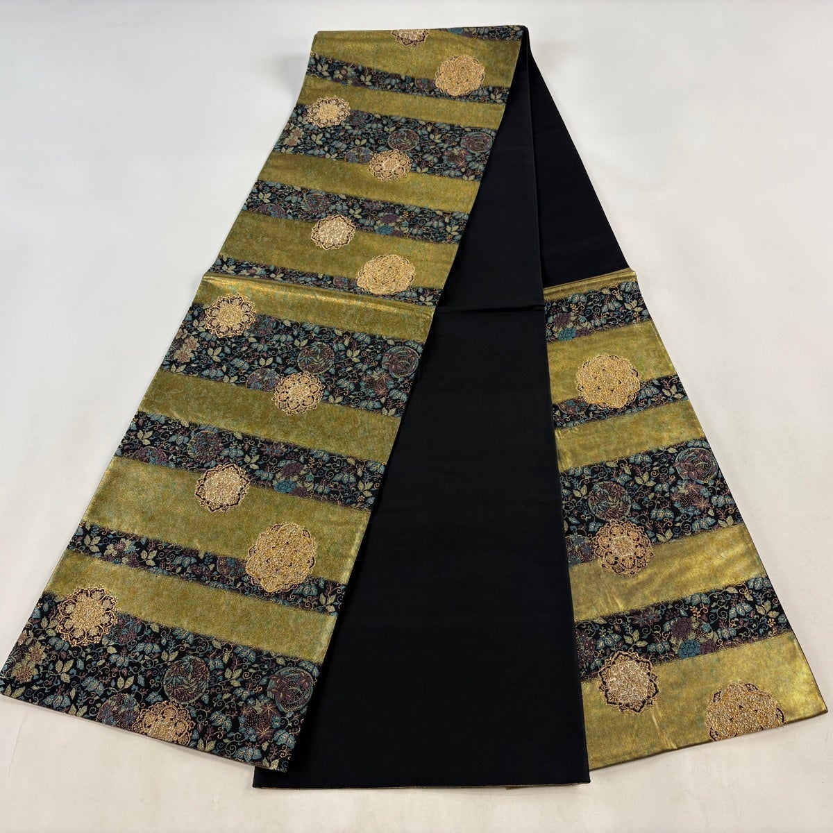 【美品】 袋帯 秀品 草花 金彩 箔 黒 六通 正絹