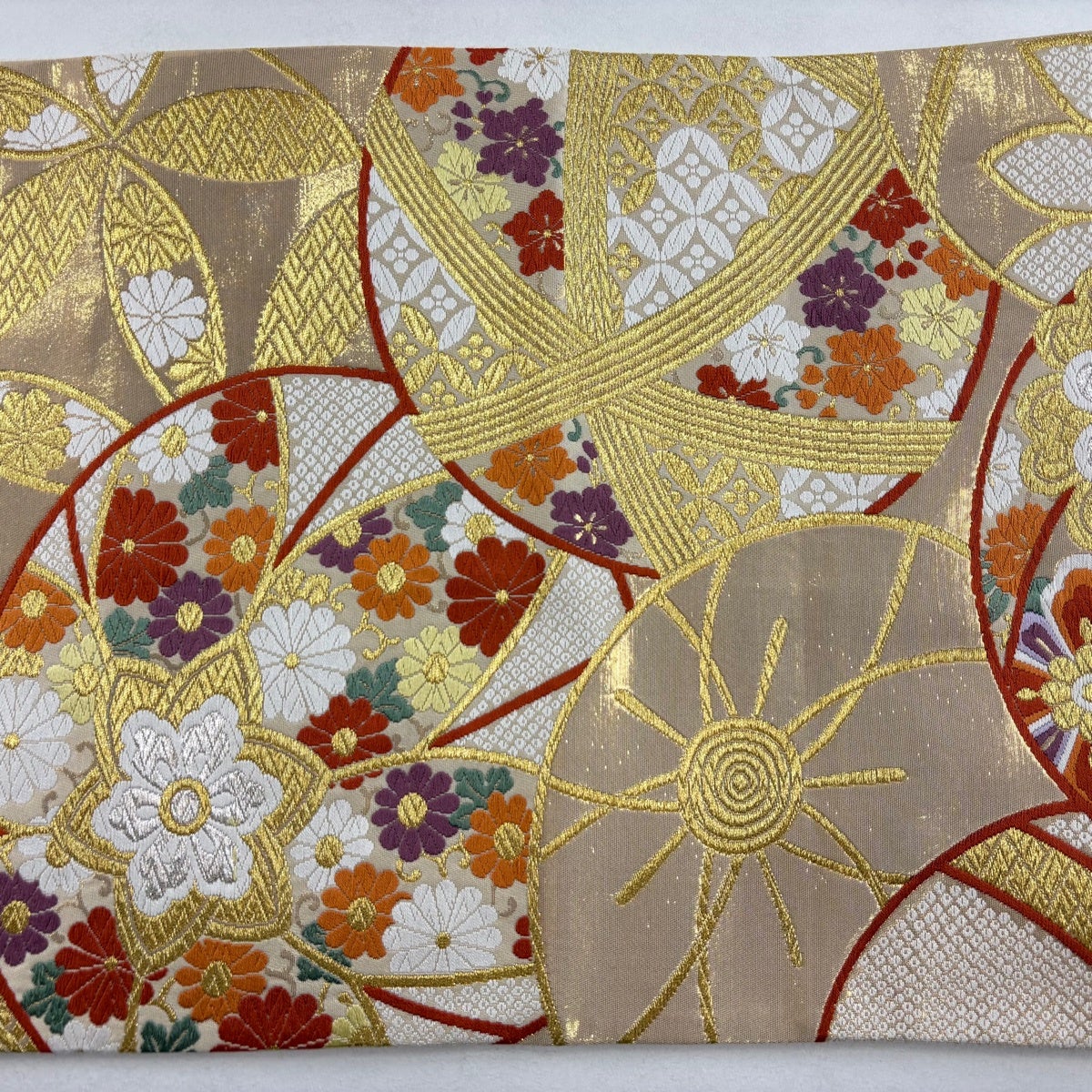 【美品】 袋帯 秀品 関西仕立て 松皮菱小袖 草花 刺繍 金糸 ベージュ 六通 正絹