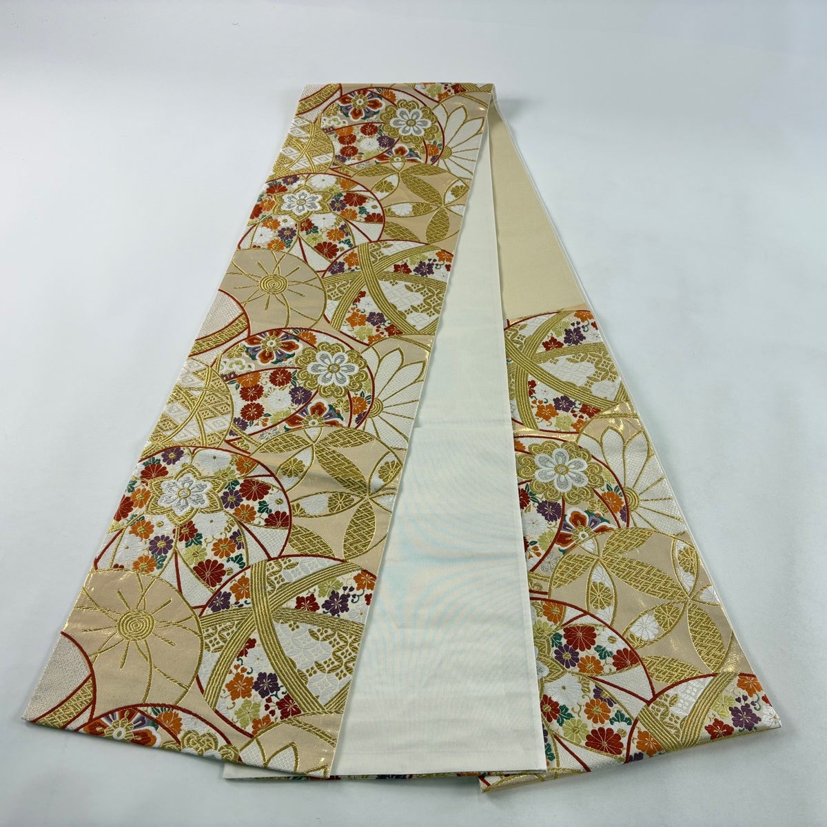 袋帯 秀品 草花 七宝 金糸 箔 金色 六通 正絹