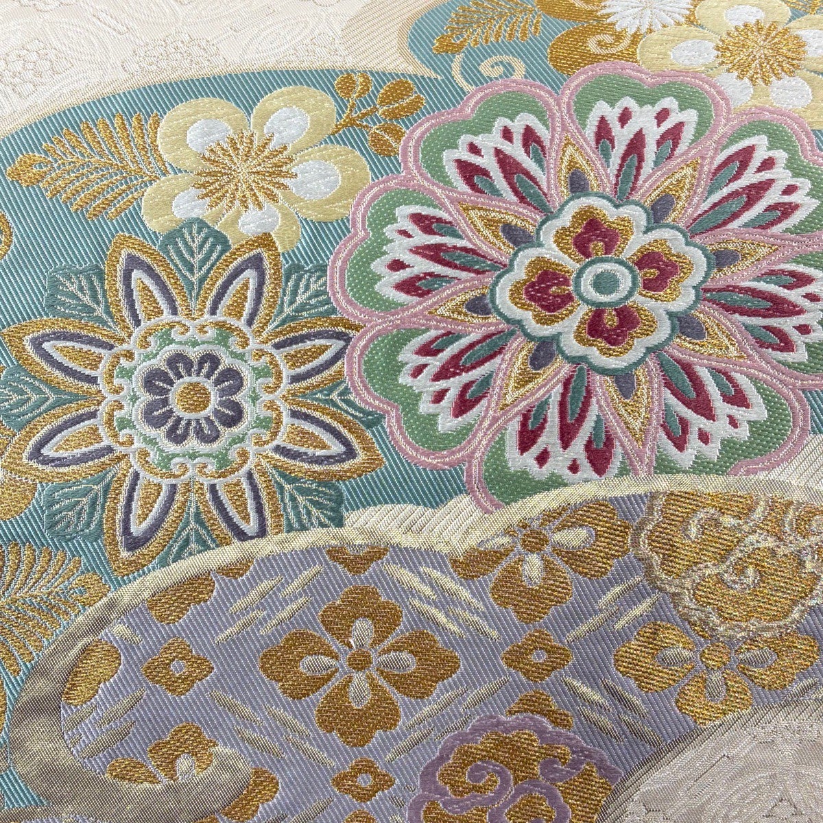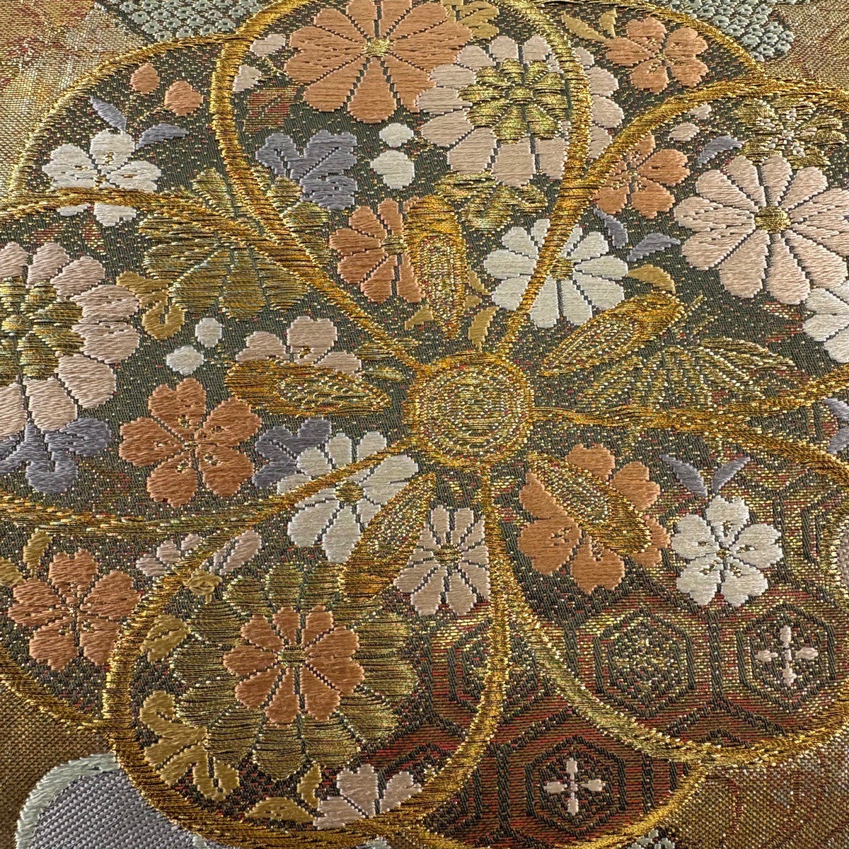 袋帯 名品 菱 菊 箔 唐織 青緑 六通 正絹