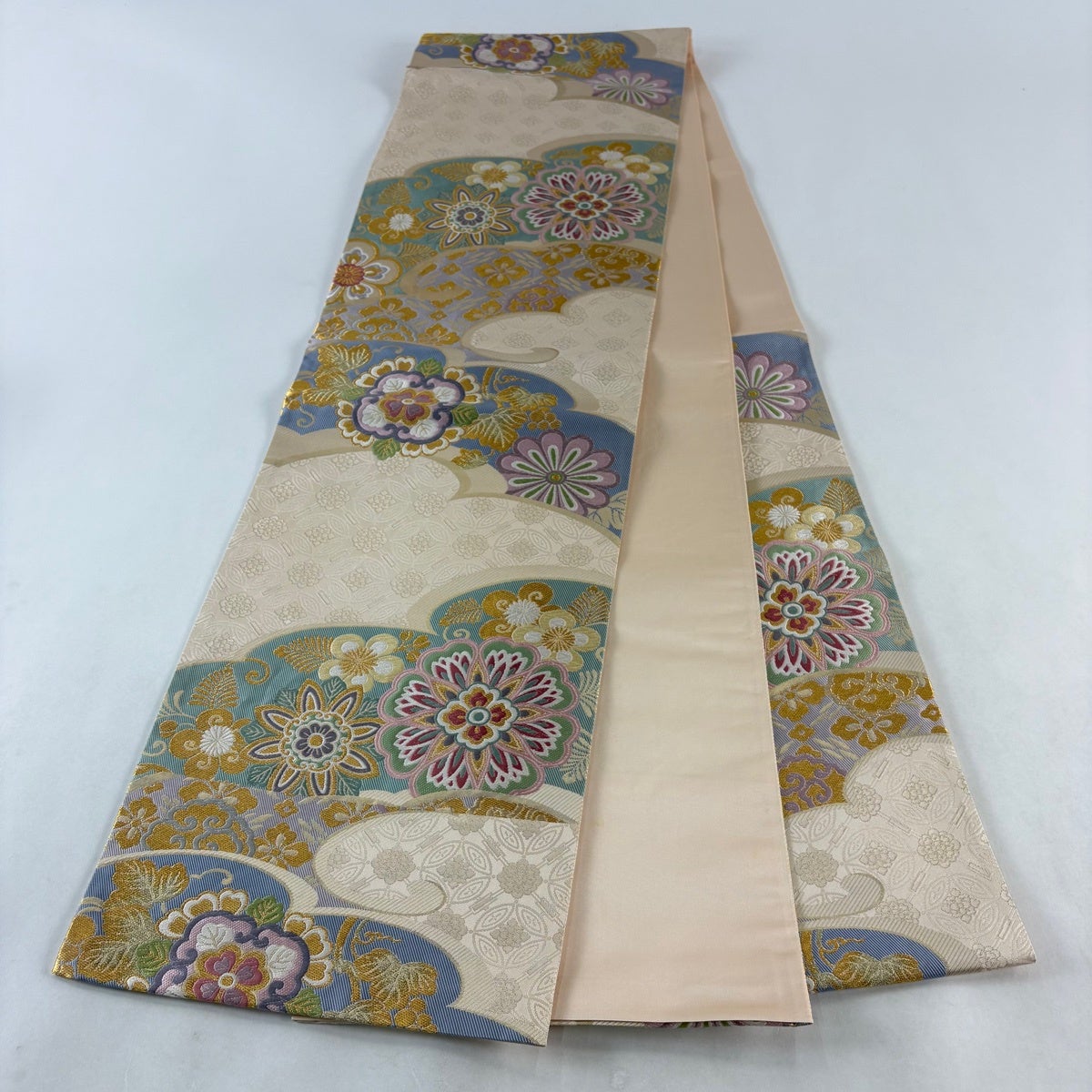 【美品】 袋帯 秀品 振袖向き 花 有職文様 箔 金糸 ベージュ 六通 正絹