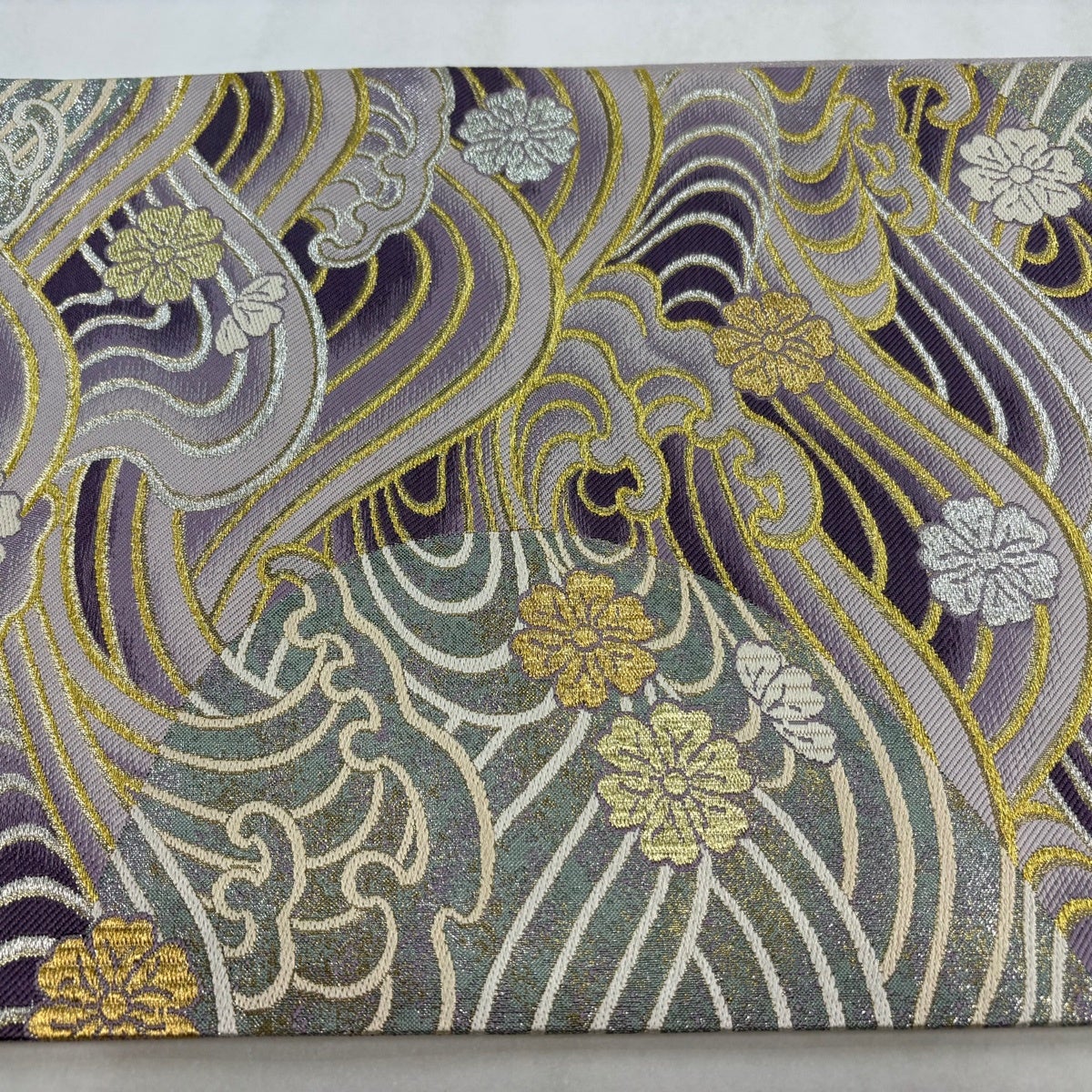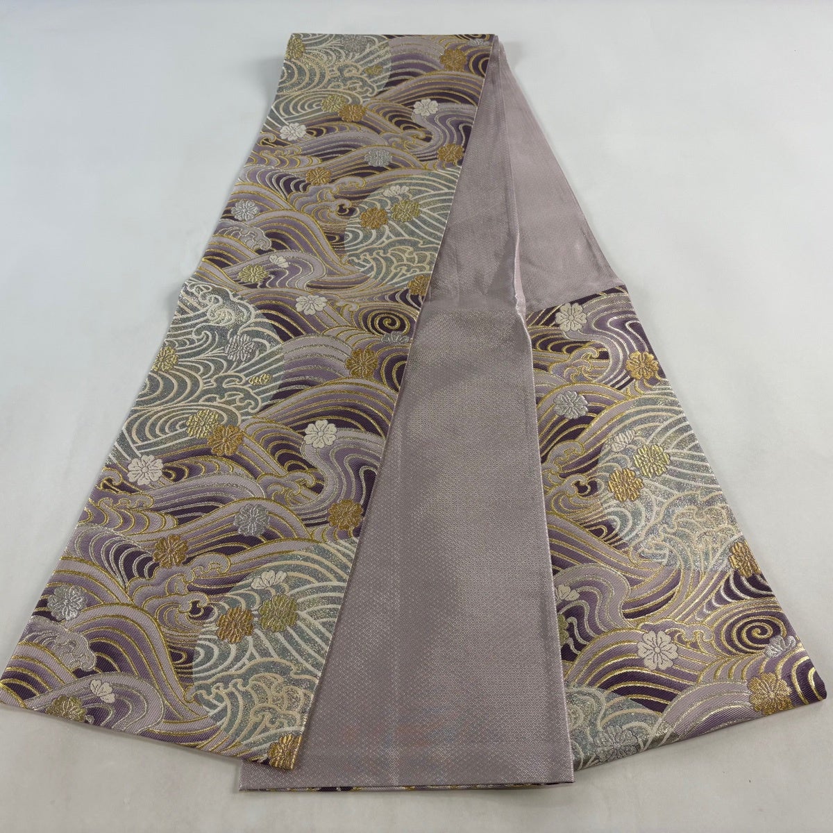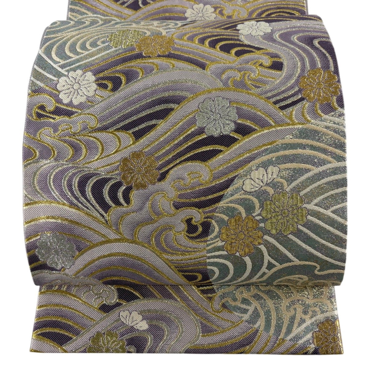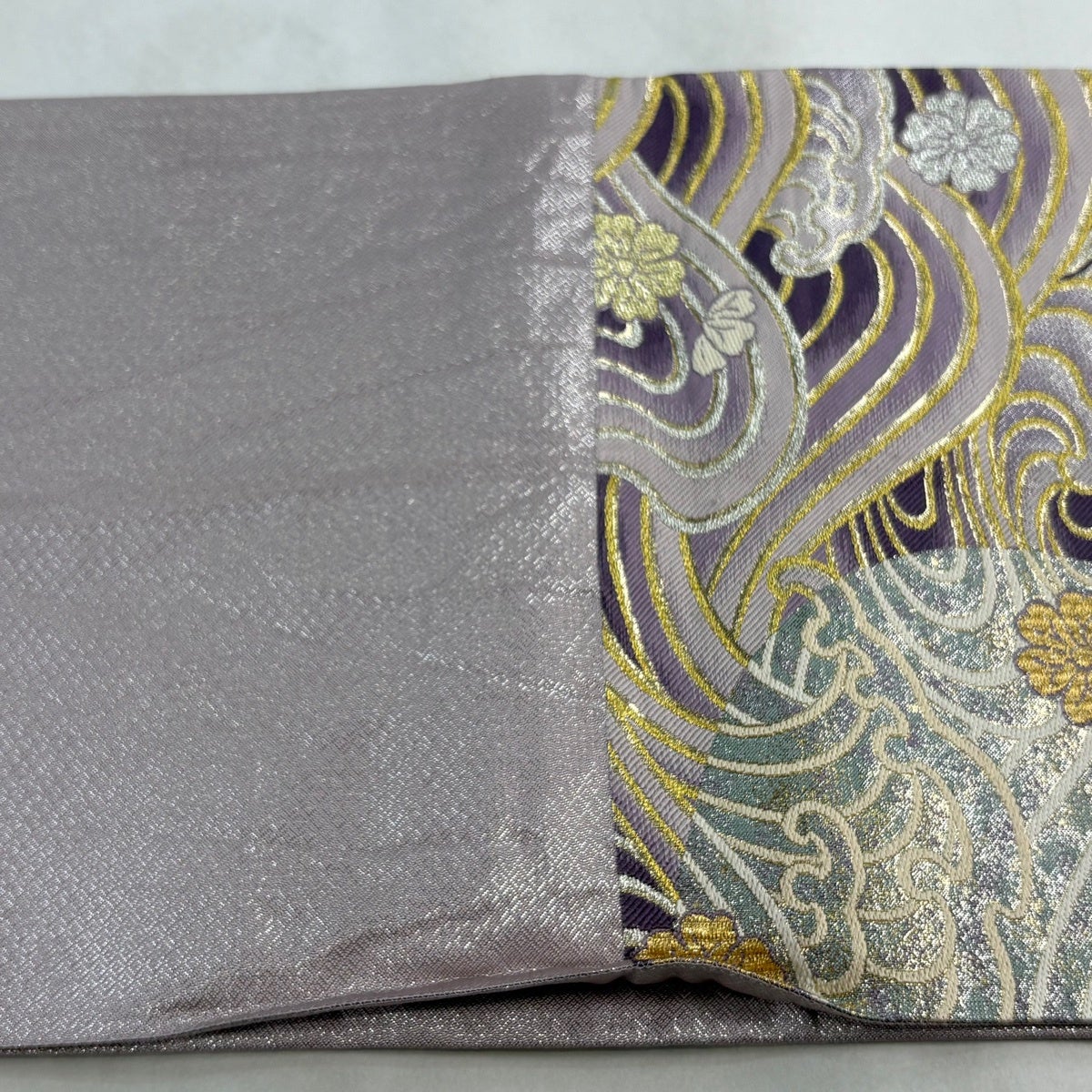 【美品】 袋帯 秀品 落款あり 振袖向き 桜 波 金銀糸 箔 薄紫 六通 正絹
