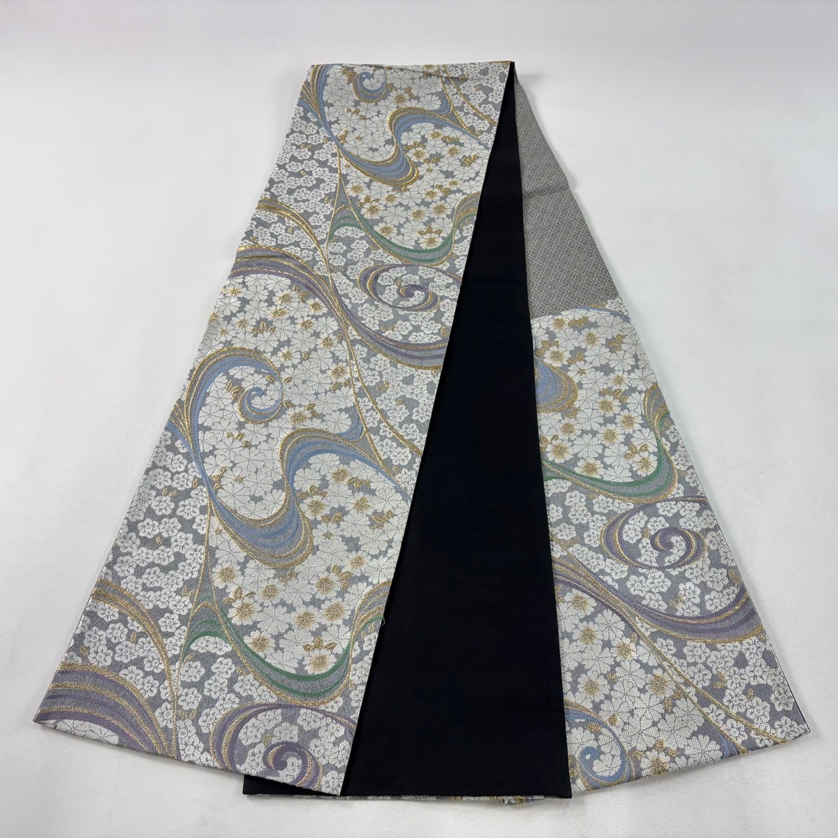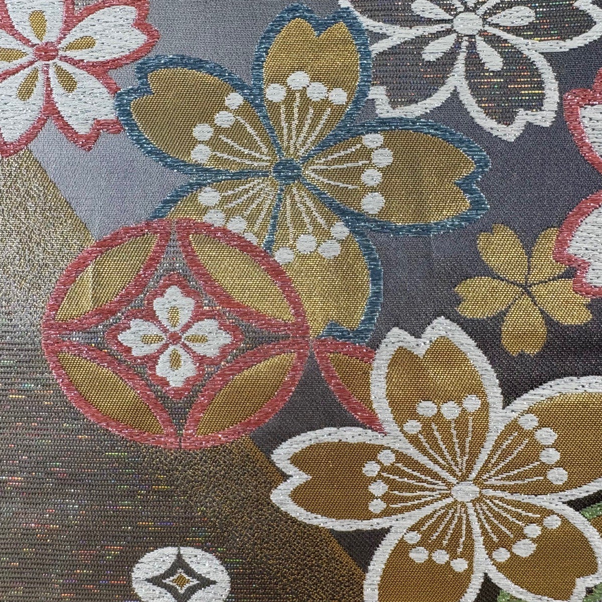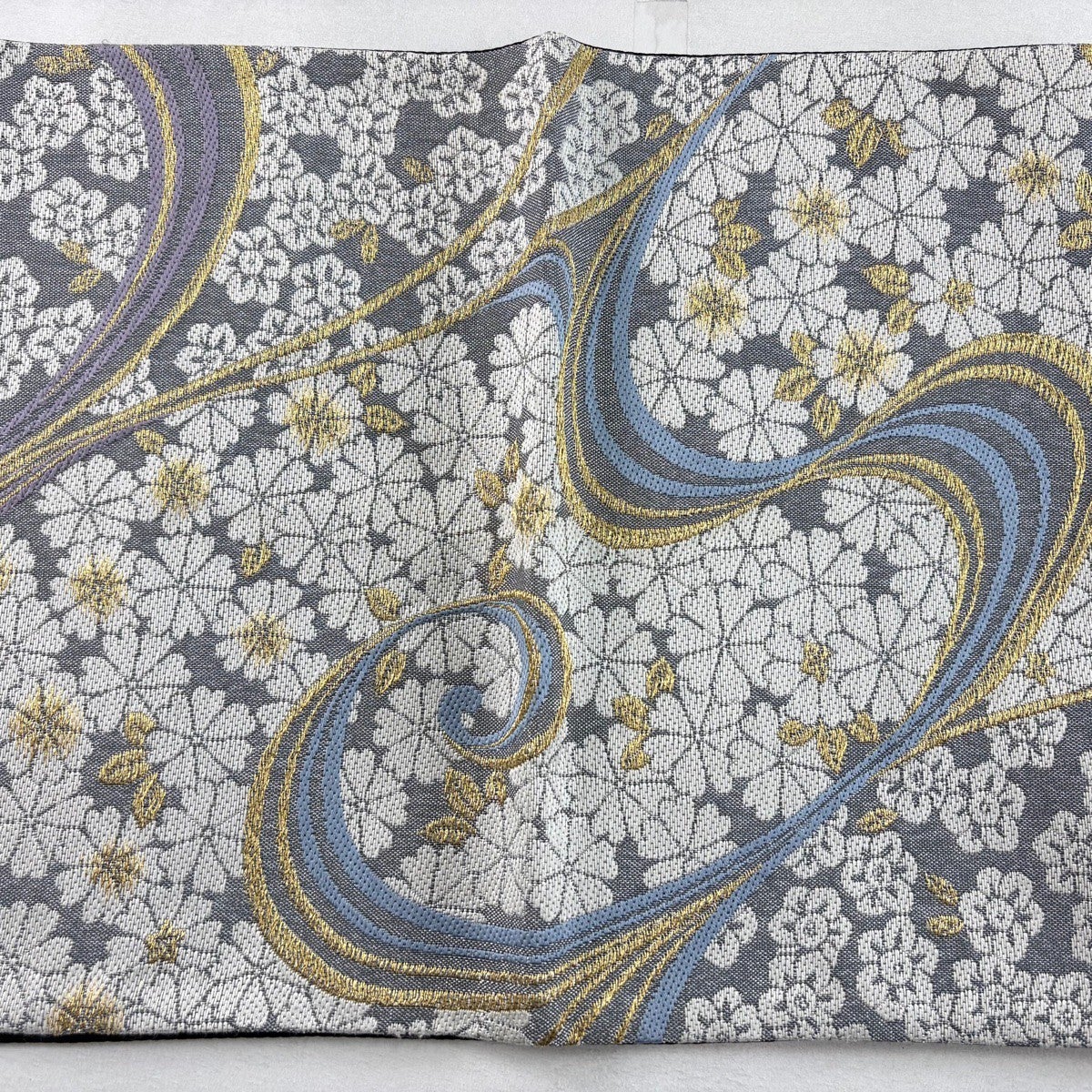 袋帯 秀品 桜 七宝 箔 金糸 灰色 六通 正絹