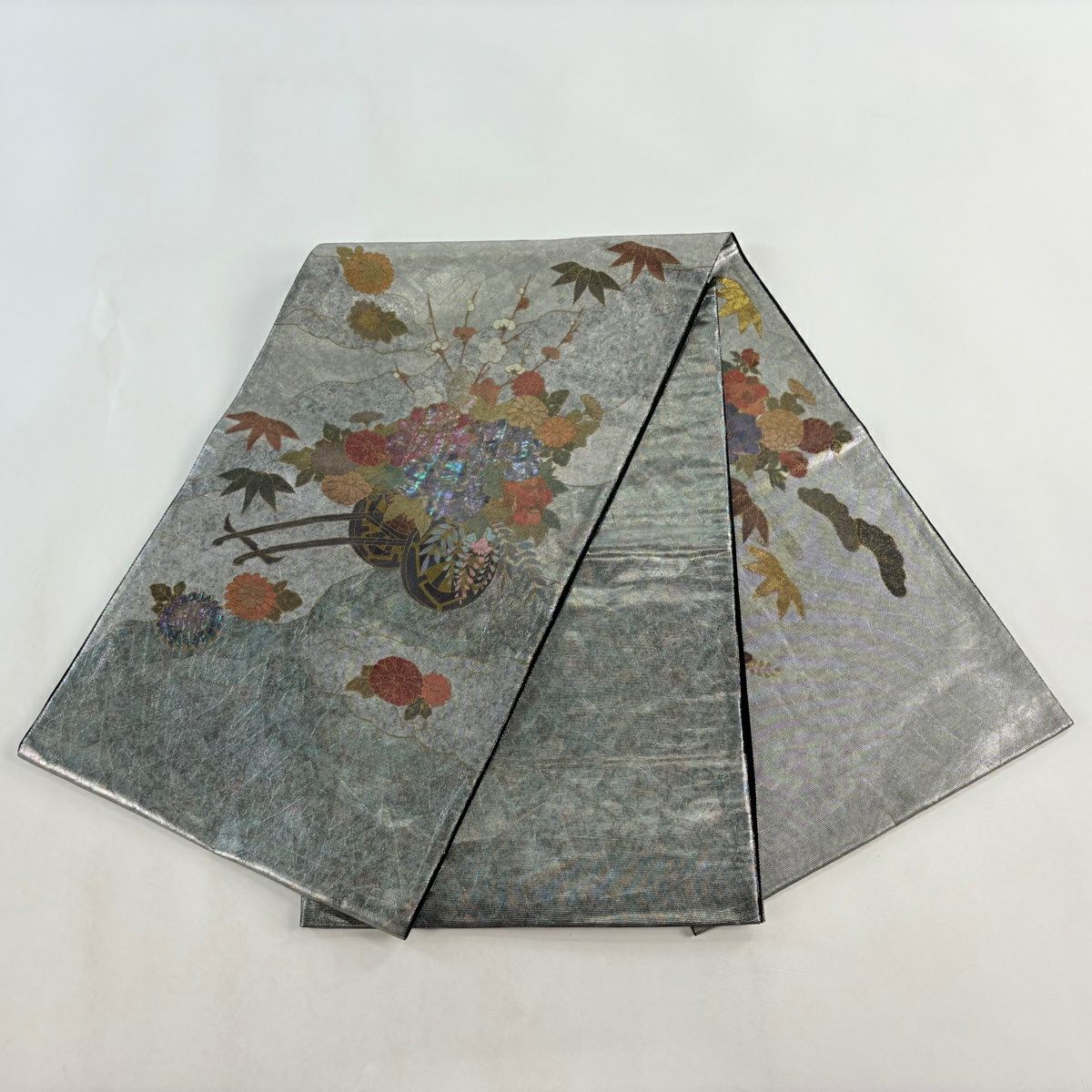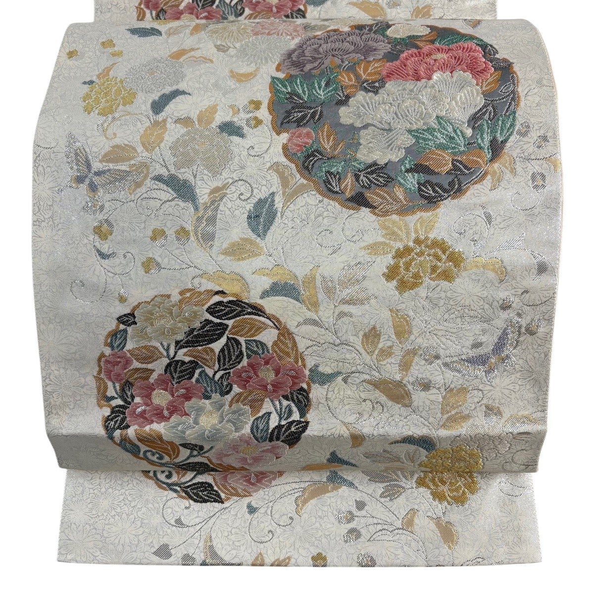 袋帯 秀品 草花 唐草 金銀糸 箔 銀色 六通 正絹