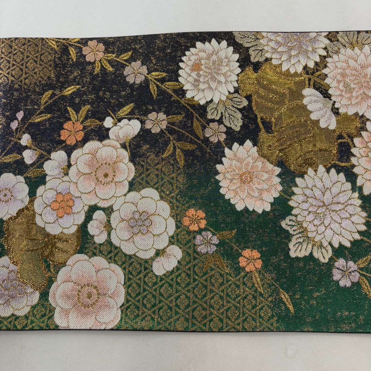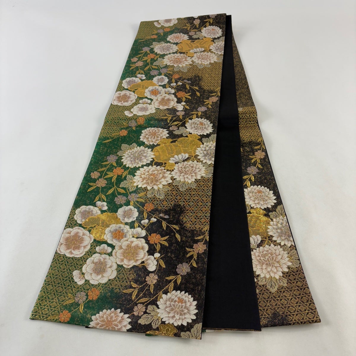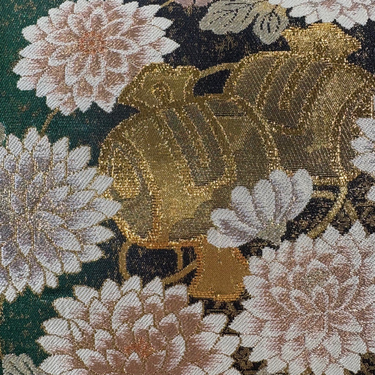 袋帯 名品 華文 花鳥 金銀糸 箔 深緑 六通 正絹