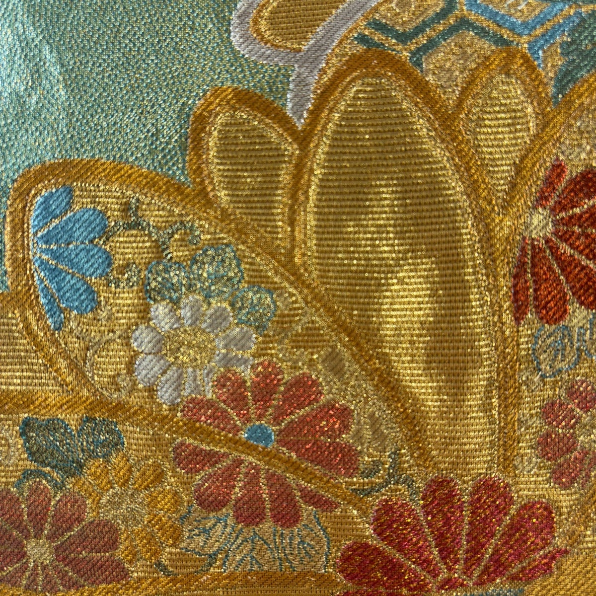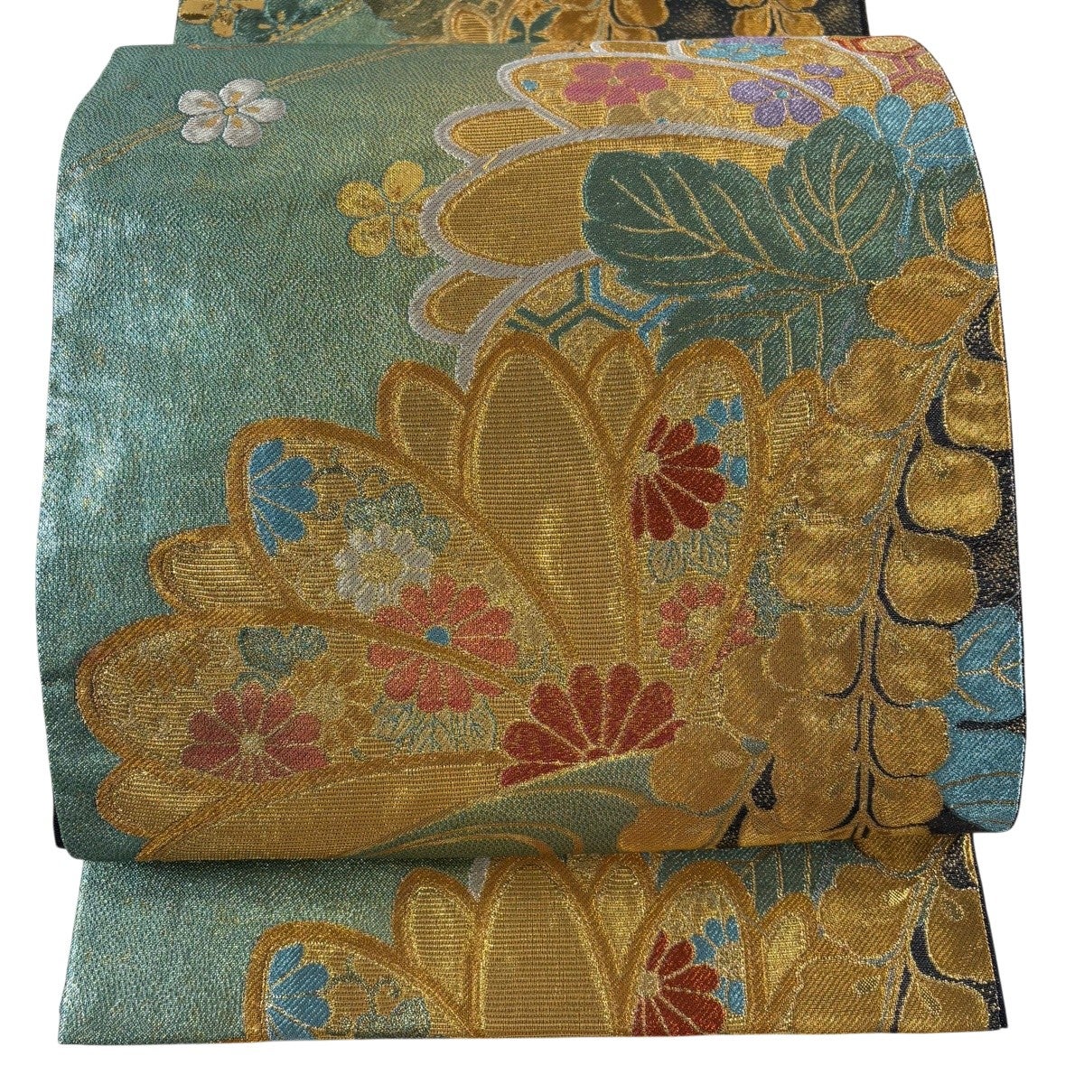 袋帯 秀品 丸文 花唐草 金糸 箔 薄緑 六通 正絹