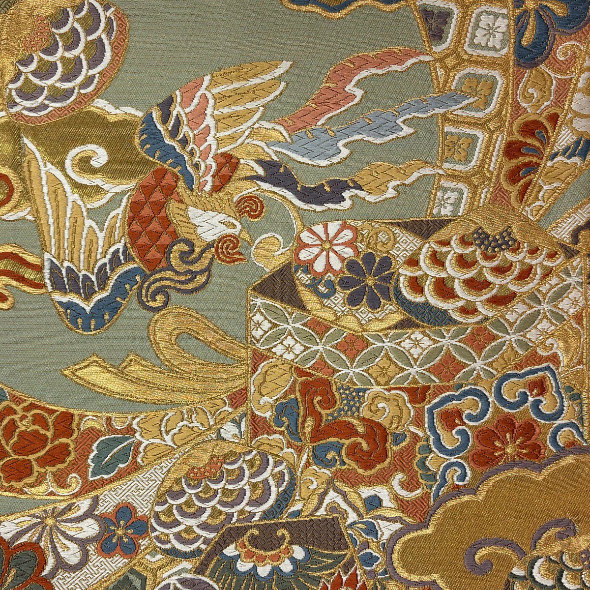 袋帯 名品 蜀江文 鳳凰 金糸 箔 灰色 六通 正絹
