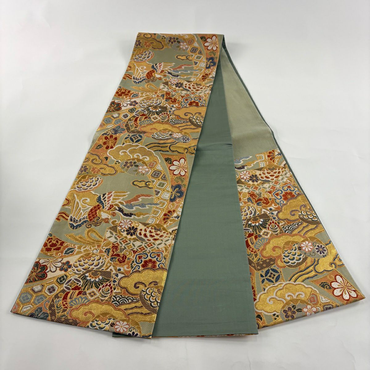 袋帯 秀品 花柄 鱗柄 金銀糸 箔 薄緑 六通 正絹