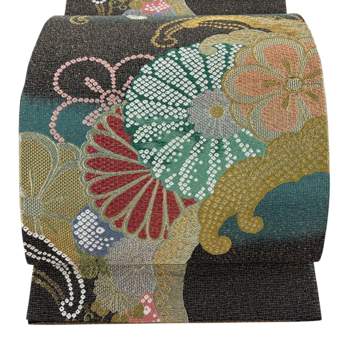 袋帯 秀品 花 金糸 箔 黒 六通 正絹
