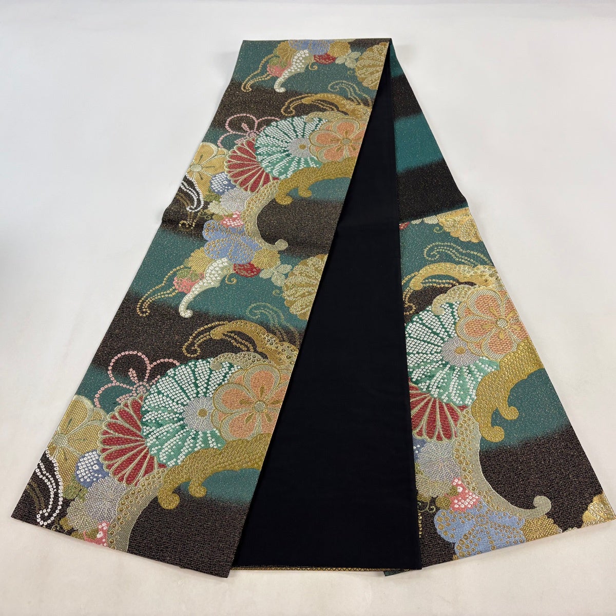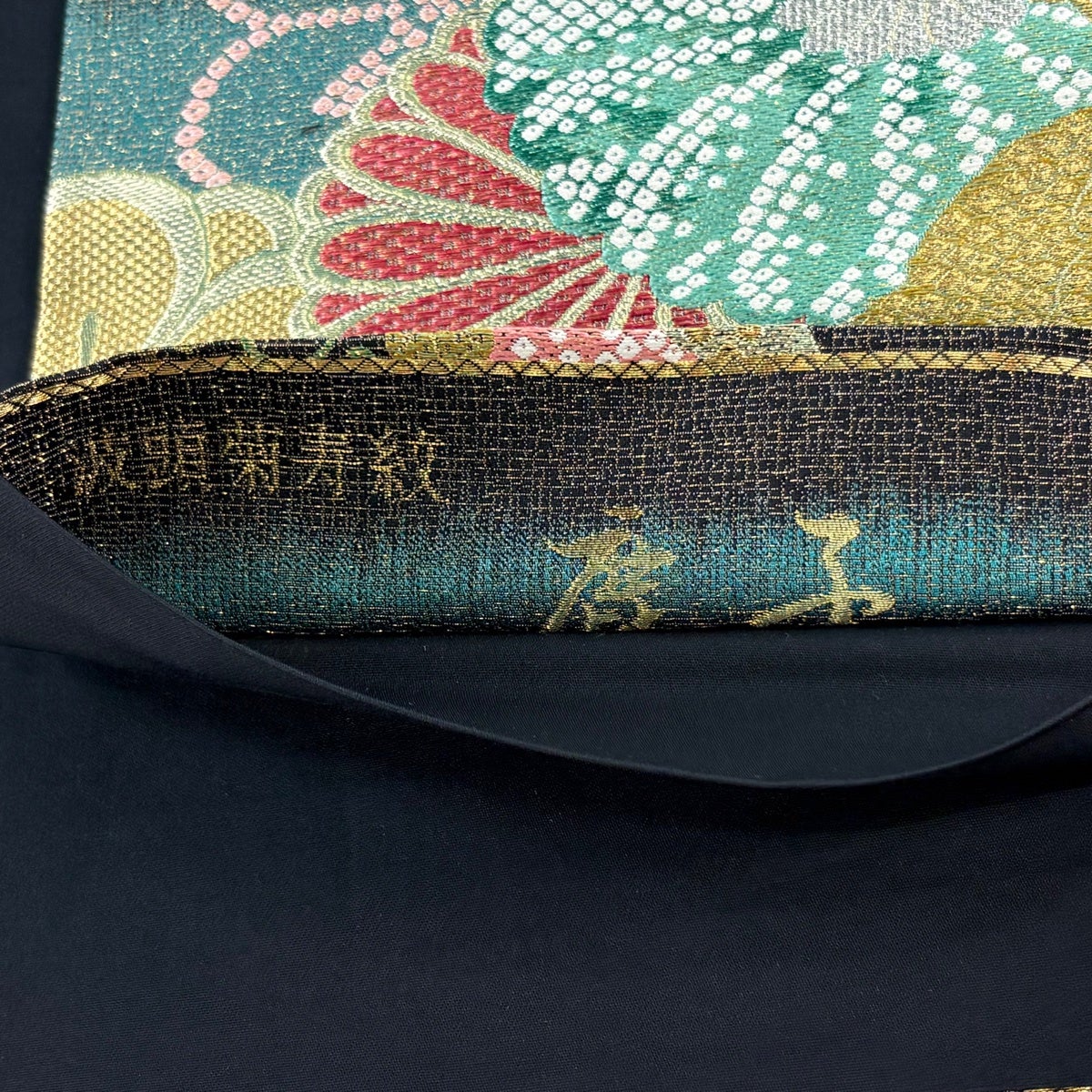 【美品】 袋帯 名品 振袖向き 波頭菊寿紋 金糸 箔 黒 六通 正絹