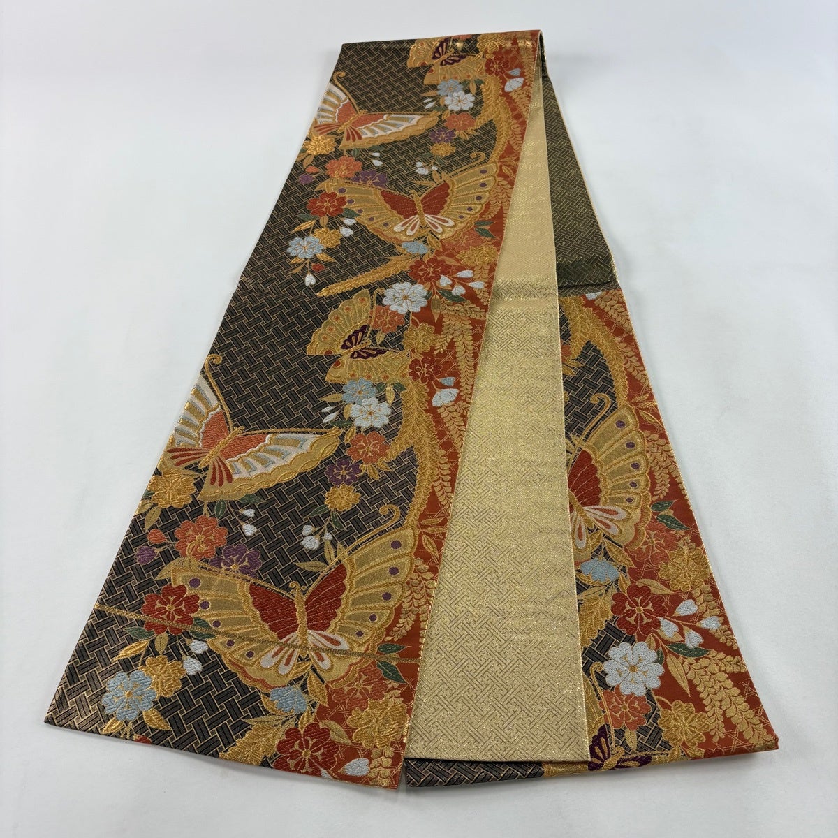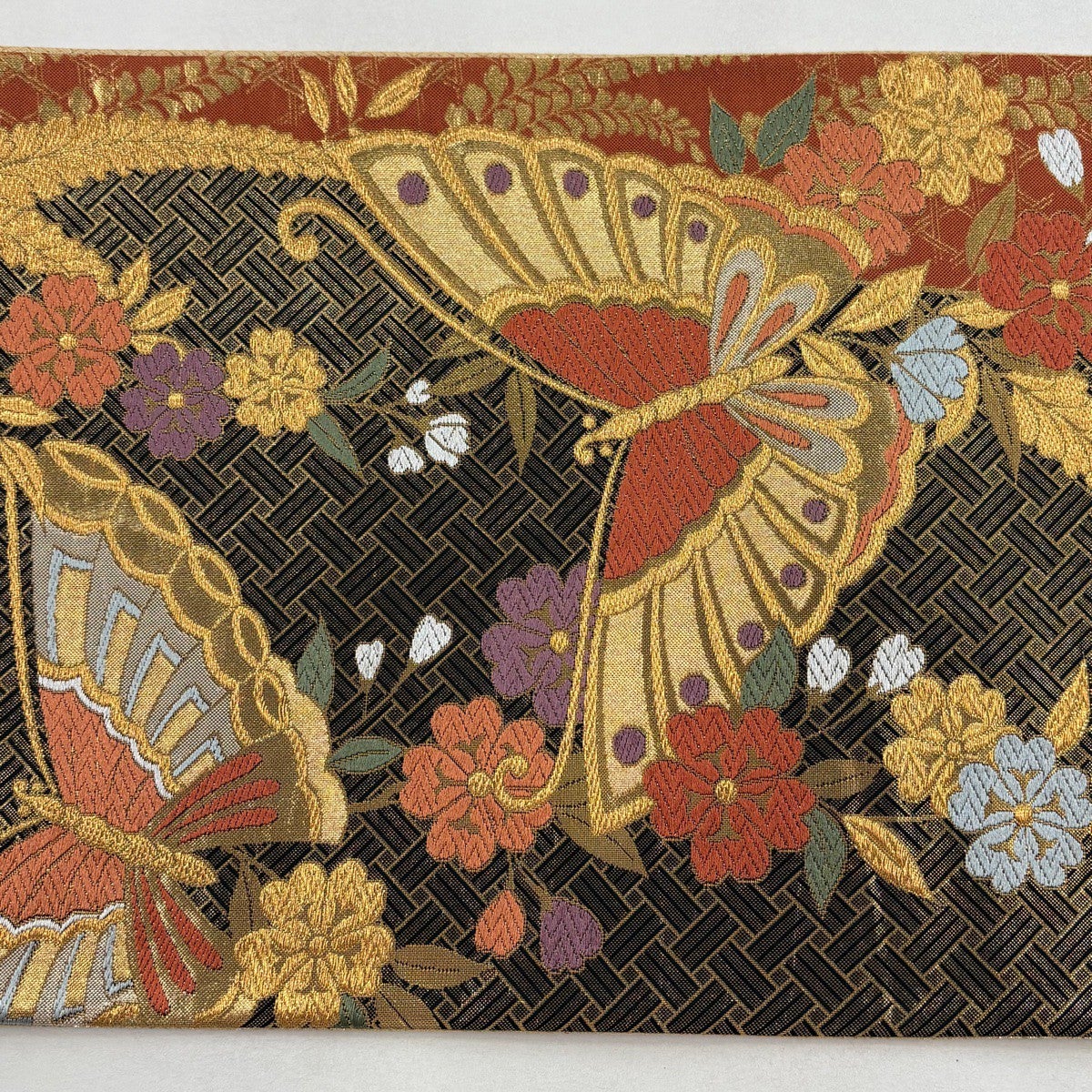 【美品】 袋帯 秀品 振袖向き 蝶 草花 箔 金糸 赤茶 六通 正絹