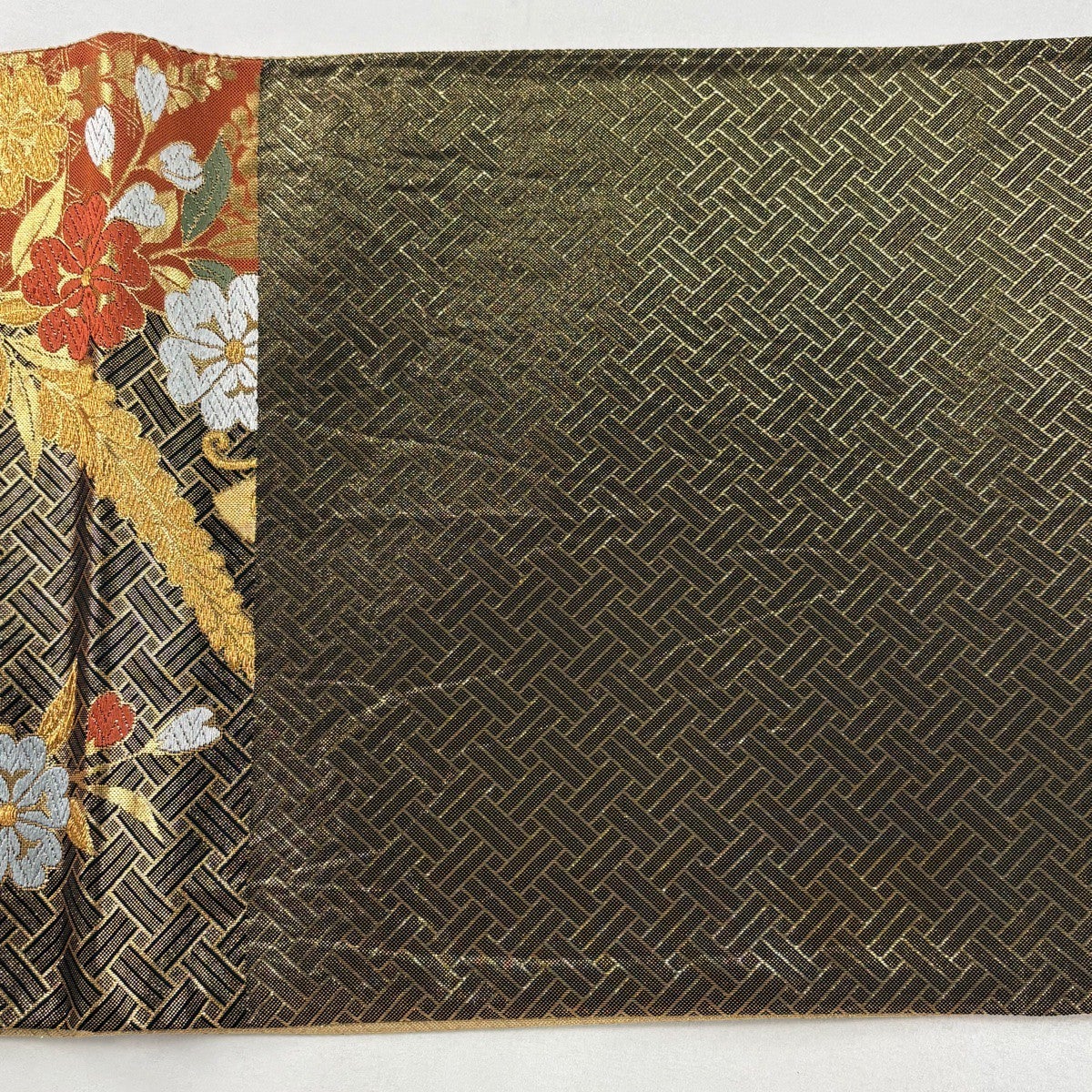 袋帯 秀品 梅 亀甲 箔 黒 六通 正絹