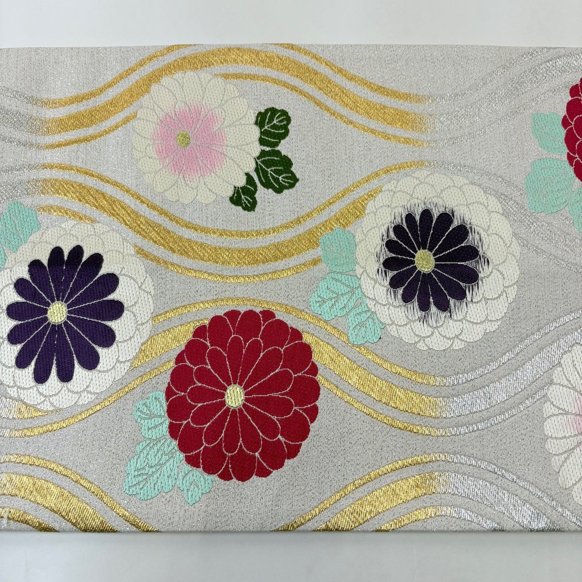 【美品】 袋帯 秀品 振袖向き 立涌 菊 箔 金銀糸 白 六通 正絹