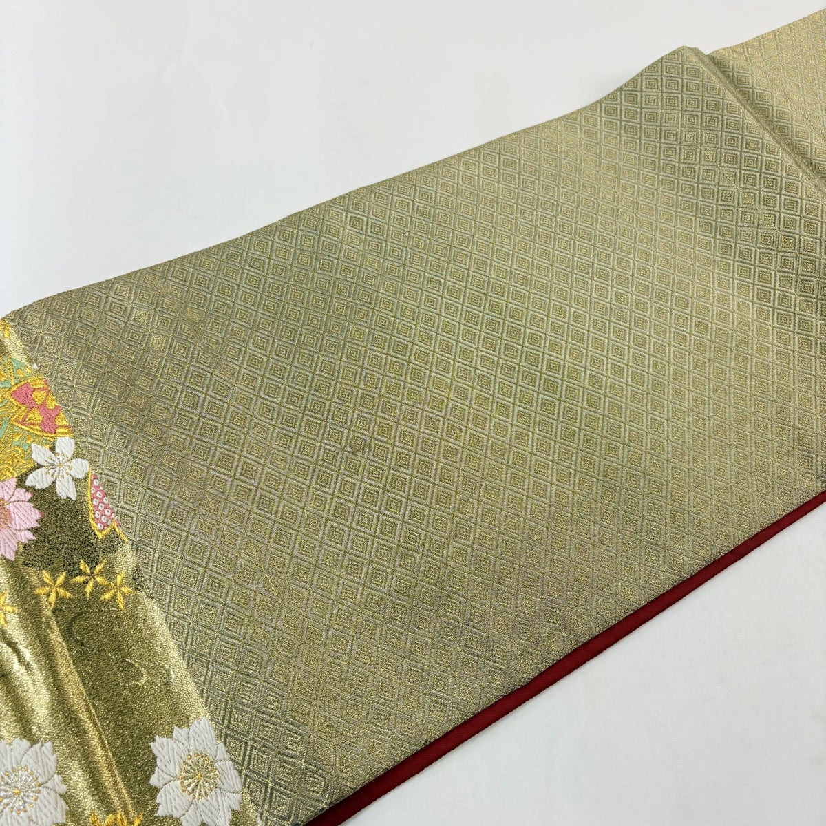 袋帯 秀品 桜 金糸 箔 緑 六通 正絹