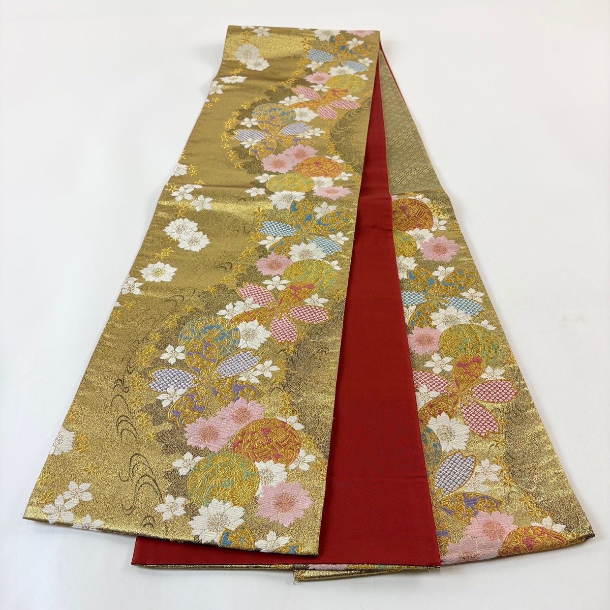 【美品】 袋帯 秀品 振袖向き 桜 手鞠 箔 金銀糸 金色 六通 正絹