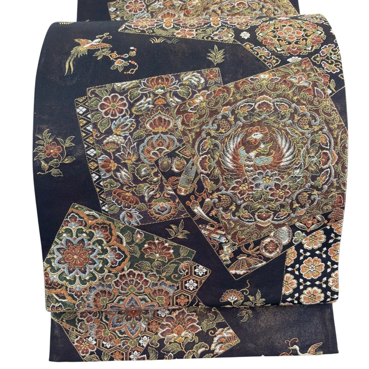 袋帯 秀品 関西仕立て 雪輪 草花 金糸 箔 茶色 六通 正絹